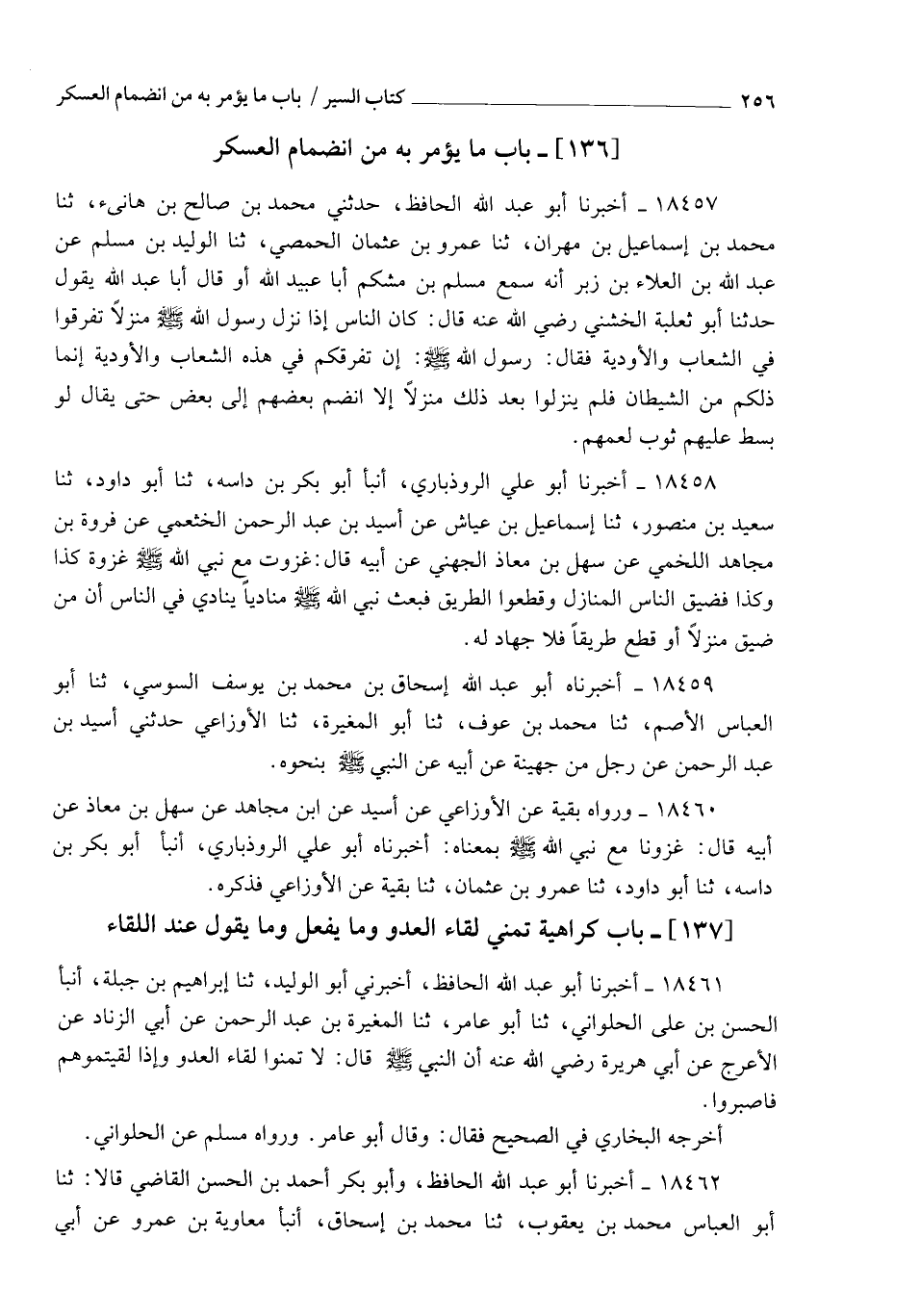 18461 - أَخْبَرَنَا أَبُو عَبْدِ اللهِ الْحَافِظُ، أَخْبَرَنِي أَبُو الْوَلِيدِ، ثنا إِبْرَاهِيمُ بْنُ جَبَلَةَ، أنبأ الْحَسَنُ بْنُ عَلِيٍّ الْحُلْوَانِيُّ، ثنا أَبُو عَامِرٍ، ثنا الْمُغِيرَةُ بْنُ عَبْدِ الرَّحْمَنِ، عَنْ أَبِي الزِّنَادِ، عَنِ الْأَعْرَجِ، عَنْ أَبِي هُرَيْرَةَ رَضِيَ اللهُ عَنْهُ أَنَّ النَّبِيَّ صَلَّى اللهُ عَلَيْهِ وَسَلَّمَ قَالَ: §" لَا تَمَنَّوْا لِقَاءَ الْعَدُوِّ وَإِذَا لَقِيتُمُوهُمْ فَاصْبِرُوا ". أَخْرَجَهُ الْبُخَارِيُّ فِي الصَّحِيحِ فَقَالَ: وَقَالَ أَبُو عَامِرٍ، وَرَوَاهُ مُسْلِمٌ عَنِ الْحُلْوَانِيِّ