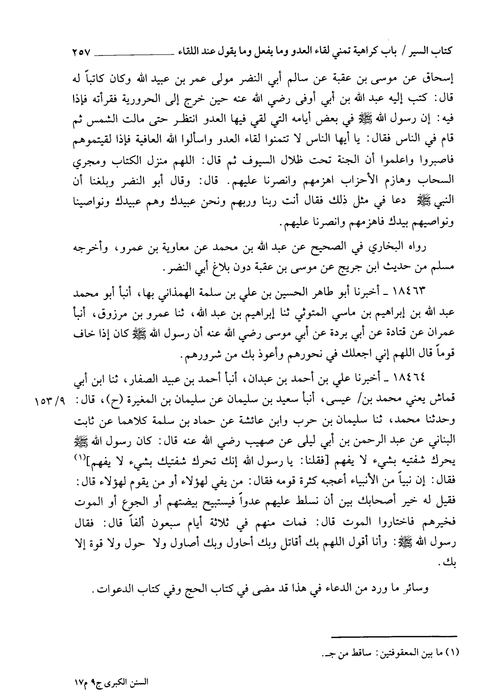 18464 - أَخْبَرَنَا عَلِيُّ بْنُ أَحْمَدَ بْنِ عَبْدَانَ، أنبأ أَحْمَدُ بْنُ عُبَيْدٍ الصَّفَّارُ، ثنا ابْنُ أَبِي قُمَاشٍ يَعْنِي مُحَمَّدَ بْنَ عِيسَى، أنبأ سَعِيدُ بْنُ سُلَيْمَانَ، عَنْ سُلَيْمَانَ بْنِ الْمُغِيرَةِ، ح قَالَ: وَحَدَّثَنَا مُحَمَّدٌ، ثنا سُلَيْمَانُ بْنُ حَرْبٍ، وَابْنُ عَائِشَةَ , عَنْ حَمَّادِ بْنِ سَلَمَةَ، كِلَاهُمَا عَنْ ثَابِتٍ الْبُنَانِيِّ، عَنْ عَبْدِ الرَّحْمَنِ بْنِ أَبِي لَيْلَى، عَنْ صُهَيْبٍ رَضِيَ اللهُ عَنْهُ قَالَ: كَانَ رَسُولُ اللهِ صَلَّى اللهُ عَلَيْهِ وَسَلَّمَ يُحَرِّكُ شَفَتَيْهِ بِشَيْءٍ لَا يُفْهَمُ فَقُلْنَا: يَا رَسُولَ اللهِ إِنَّكَ تُحَرِّكُ شَفَتَيْكَ بِشَيْءٍ لَا يُفْهَمُ , فَقَالَ: " §إِنَّ نَبِيًّا مِنَ الْأَنْبِيَاءِ أَعْجَبَهُ كَثْرَةُ قَوْمِهِ , فَقَالَ: مَنْ يَفِي لِهَؤُلَاءِ أَوْ مَنْ يَقُومُ لِهَؤُلَاءِ؟ قَالَ: فَقِيلَ لَهُ خَيِّرْ أَصْحَابَكَ بَيْنَ أَنْ نُسَلِّطَ عَلَيْهِمْ عَدُوًّا فَيَسْتَبِيحَ بَيْضَتَهُمْ أَوِ الْجُوعَ أَوِ الْمَوْتَ فَخَيَّرَهُمْ فَاخْتَارُوا الْمَوْتَ , قَالَ: فَمَاتَ مِنْهُمْ فِي ثَلَاثَةِ أَيَّامٍ سَبْعُونَ أَلْفًا. قَالَ: فَقَالَ رَسُولُ اللهِ صَلَّى اللهُ عَلَيْهِ وَسَلَّمَ: " وَأَنَا أَقُولُ: اللهُمَّ بِكَ أُقَاتِلُ , وَبِكَ أُحَاوِلُ , وَبِكَ أُصَاوِلُ , وَلَا حَوْلَ وَلَا قُوَّةَ إِلَّا بِكَ " وَسَائِرُ مَا وَرَدَ مِنَ الدُّعَاءِ فِي هَذَا قَدْ مَضَى فِي كِتَابِ الْحَجِّ وَفِي كِتَابِ الدَّعَوَاتِ