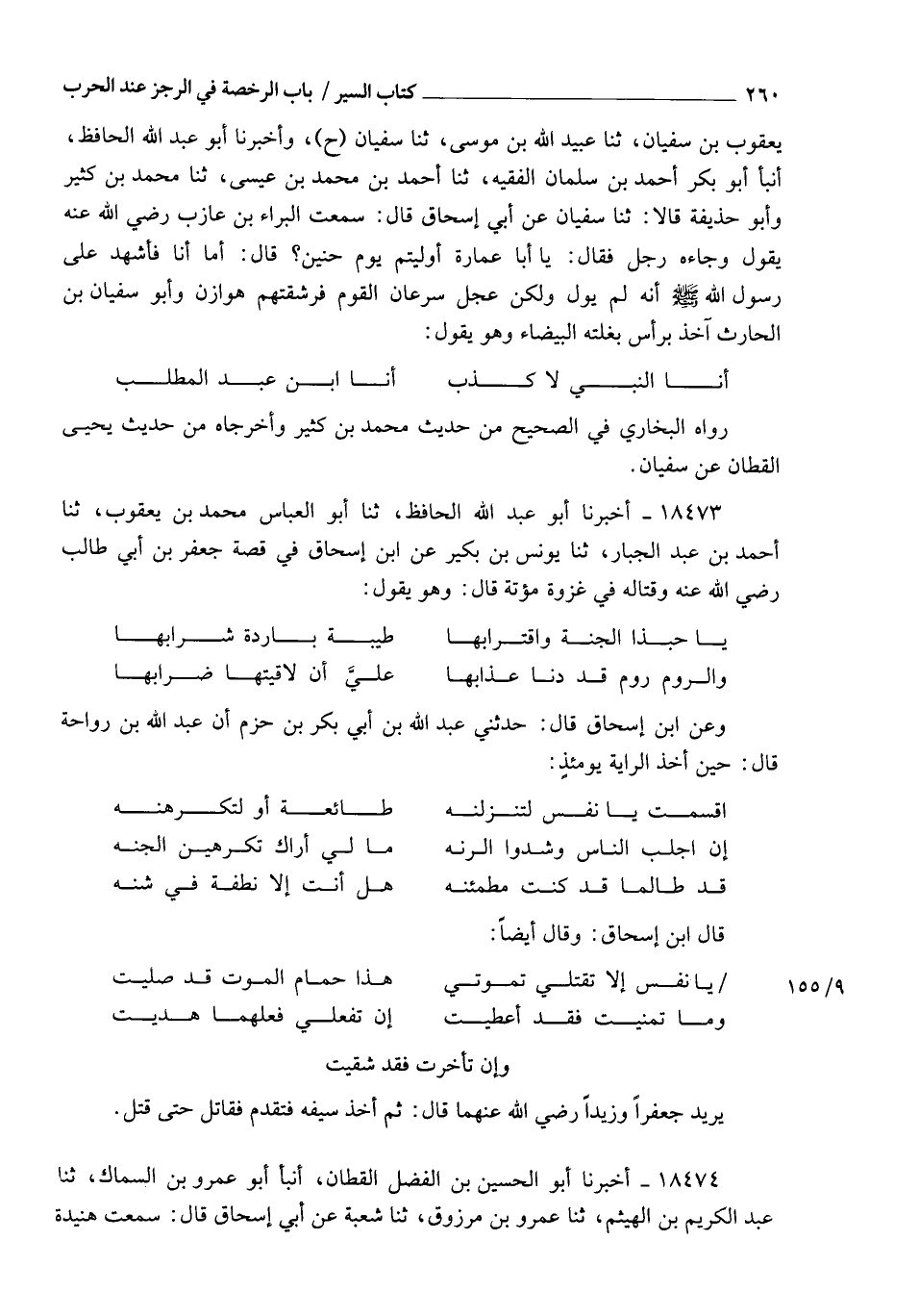 18473 - أَخْبَرَنَا أَبُو عَبْدِ اللهِ الْحَافِظُ، ثنا أَبُو الْعَبَّاسِ مُحَمَّدُ بْنُ يَعْقُوبَ , ثنا أَحْمَدُ بْنُ عَبْدِ الْجَبَّارِ، ثنا يُونُسُ بْنُ بُكَيْرٍ، عَنِ ابْنِ إِسْحَاقَ، فِي قِصَّةِ جَعْفَرِ بْنِ أَبِي طَالِبٍ رَضِيَ اللهُ عَنْهُ وَقِتَالِهِ فِي غَزْوَةِ مُؤْتَةَ قَالَ: وَهُوَ يَقُولُ: