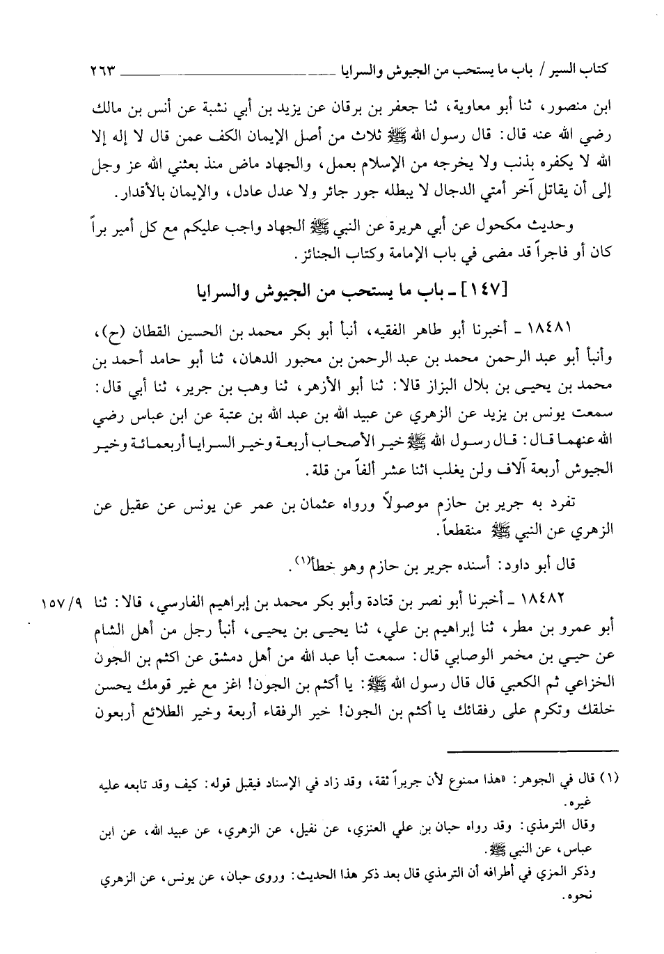 18481 - أَخْبَرَنَا أَبُو طَاهِرٍ الْفَقِيهُ، أنبأ أَبُو بَكْرٍ مُحَمَّدُ بْنُ الْحُسَيْنِ الْقَطَّانُ , ح وأنبأ أَبُو عَبْدِ الرَّحْمَنِ مُحَمَّدُ بْنُ عَبْدِ الرَّحْمَنِ بْنِ مَحْبُوبٍ الدَّهَّانُ , ثنا أَبُو حَامِدٍ أَحْمَدُ بْنُ مُحَمَّدِ بْنِ يَحْيَى بْنِ بِلَالٍ الْبَزَّازُ قَالَا: ثنا أَبُو الْأَزْهَرِ، ثنا وَهْبُ بْنُ جَرِيرٍ، ثنا أَبِي قَالَ: سَمِعْتُ يُونُسَ بْنَ يَزِيدَ، عَنِ الزُّهْرِيِّ، عَنْ عُبَيْدِ اللهِ بْنِ عَبْدِ اللهِ بْنِ عُتْبَةَ، عَنِ ابْنِ عَبَّاسٍ رَضِيَ اللهُ عَنْهُمَا قَالَ: قَالَ رَسُولُ اللهِ صَلَّى اللهُ عَلَيْهِ وَسَلَّمَ: §" خَيْرُ الْأَصْحَابِ أَرْبَعَةٌ , وَخَيْرُ السَّرَايَا أَرْبَعُمِائَةٍ , وَخَيْرُ الْجُيُوشِ أَرْبَعَةُ آلَافٍ , وَلَنْ يُغْلَبَ اثْنَا عَشَرَ أَلْفًا مِنْ قِلَّةٍ ". تَفَرَّدَ بِهِ جَرِيرُ بْنُ حَازِمٍ مَوْصُولًا , وَرَوَاهُ عُثْمَانُ بْنُ عُمَرَ عَنْ يُونُسَ، عَنْ عَقِيلٍ، عَنِ الزُّهْرِيِّ، عَنِ النَّبِيِّ صَلَّى اللهُ عَلَيْهِ وَسَلَّمَ مُنْقَطِعًا قَالَ أَبُو دَاوُدَ: أَسْنَدَهُ جَرِيرُ بْنُ حَازِمٍ وَهُوَ خَطَأٌ