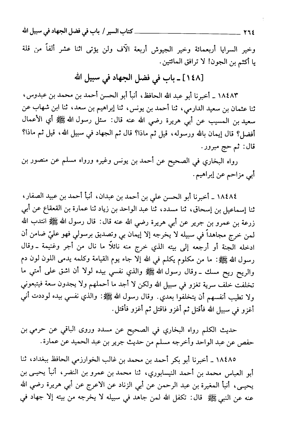 18485 - أَخْبَرَنَا أَبُو بَكْرٍ أَحْمَدُ بْنُ مُحَمَّدِ بْنِ غَالِبٍ الْخُوَارِزْمِيُّ الْحَافِظُ بِبَغْدَادَ، ثنا أَبُو الْعَبَّاسِ مُحَمَّدُ بْنُ أَحْمَدَ النَّيْسَابُورِيُّ , ثنا مُحَمَّدُ بْنُ عَمْرِو بْنِ النَّضْرِ، أنبأ يَحْيَى بْنُ يَحْيَى، أنبأ الْمُغِيرَةُ بْنُ عَبْدِ الرَّحْمَنِ، عَنْ أَبِي الزِّنَادِ، عَنِ الْأَعْرَجِ، عَنْ أَبِي هُرَيْرَةَ رَضِيَ اللهُ عَنْهُ عَنِ النَّبِيِّ صَلَّى اللهُ عَلَيْهِ وَسَلَّمَ قَالَ: §" تَكَفَّلَ اللهُ لِمَنْ جَاهَدَ فِي سَبِيلِهِ لَا يُخْرِجُهُ مِنْ بَيْتِهِ إِلَّا جِهَادٌ فِي -[265]- سَبِيلِهِ وَتَصْدِيقُ كَلِمَتِهِ بِأَنْ يُدْخِلَهُ الْجَنَّةَ أَوْ يُرْجِعَهُ إِلَى مَسْكَنِهِ الَّذِي خَرَجَ مِنْهُ مَعَ مَا نَالَ مِنْ أَجْرٍ أَوْ غَنِيمَةٍ