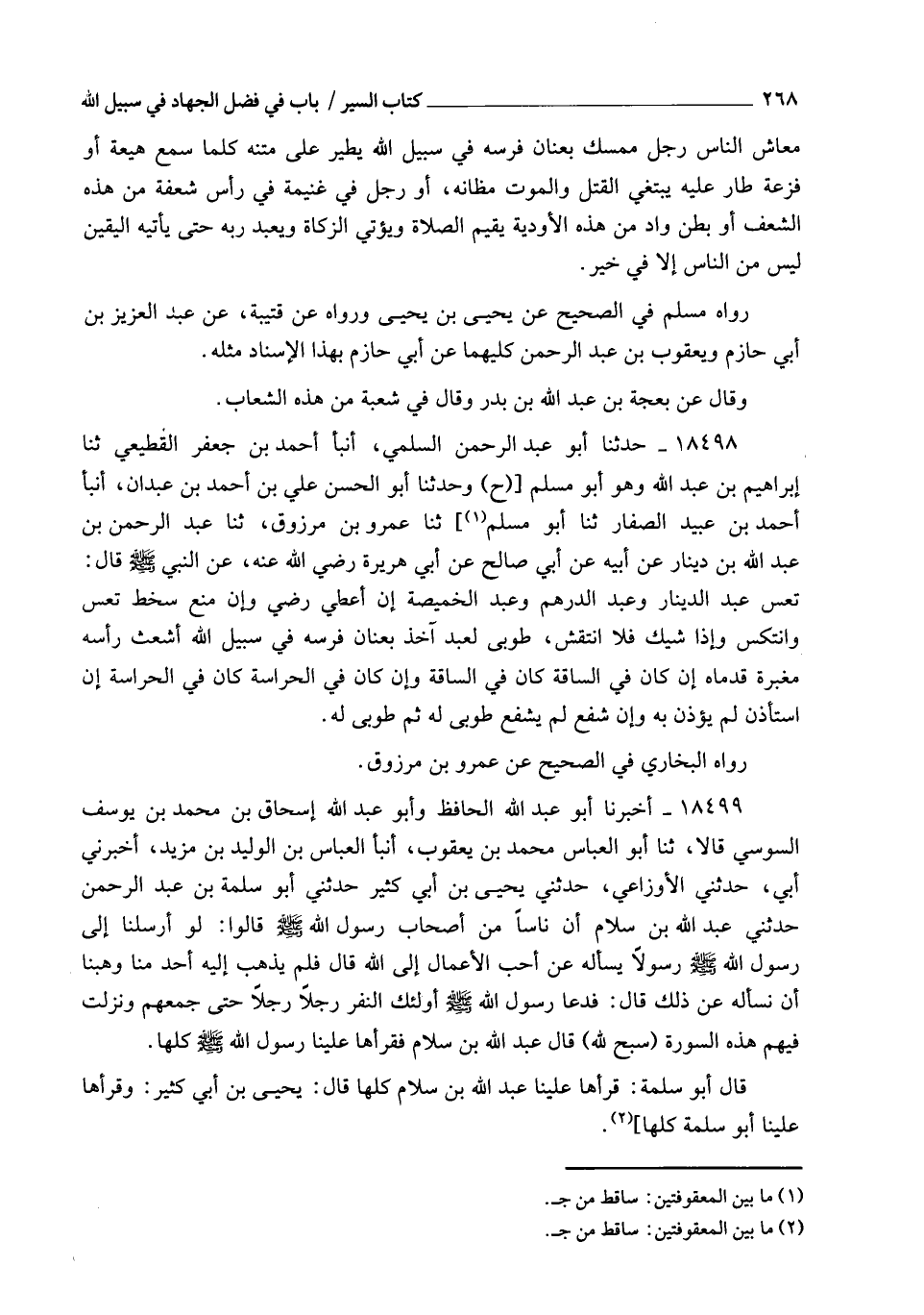 18498 - حَدَّثَنَا أَبُو عَبْدِ الرَّحْمَنِ السُّلَمِيُّ، أنبأ أَحْمَدُ بْنُ جَعْفَرٍ الْقَطِيعِيُّ، ثنا إِبْرَاهِيمُ بْنُ عَبْدِ اللهِ، وَهُوَ أَبُو مُسْلِمٍ , ح وَحَدَّثَنَا أَبُو الْحَسَنِ عَلِيُّ بْنُ أَحْمَدَ بْنِ عَبْدَانَ , أنبأ أَحْمَدُ بْنُ عُبَيْدٍ الصَّفَّارُ، ثنا أَبُو مُسْلِمٍ، ثنا عَمْرُو بْنُ مَرْزُوقٍ، ثنا عَبْدُ الرَّحْمَنِ بْنُ عَبْدِ اللهِ بْنِ دِينَارٍ، عَنْ أَبِيهِ، عَنْ أَبِي صَالِحٍ، عَنْ أَبِي هُرَيْرَةَ رَضِيَ اللهُ عَنْهُ , عَنِ النَّبِيِّ صَلَّى اللهُ عَلَيْهِ وَسَلَّمَ قَالَ: §" تَعِسَ عَبْدُ الدِّينَارِ وَعَبْدُ الدِّرْهَمِ وَعَبْدُ الْخَمِيصَةِ , إِنْ أُعْطِيَ رَضِيَ , وَإِنْ مُنِعَ سَخِطَ , تَعِسَ وَانْتَكَسَ , وَإِذَا شِيكَ فَلَا انْتَقَشَ , طُوبَى لِعَبْدٍ آخِذٍ بِعِنَانِ فَرَسِهِ فِي سَبِيلِ اللهِ , أَشْعَثَ رَأْسُهُ , مُغَبَّرَّةٍ قَدَمَاهُ , إِنْ كَانَ فِي السَّاقَةِ كَانَ فِي السَّاقَةِ , وَإِنْ كَانَ فِي الْحِرَاسَةِ كَانَ فِي الْحِرَاسَةِ , إِنِ اسْتَأْذَنَ لَمْ يُؤَذَنْ لَهُ , وَإِنْ شَفَعَ لَمْ يُشَفَّعْ , طُوبَى لَهُ ثُمَّ طُوبَى لَهُ ". رَوَاهُ الْبُخَارِيُّ فِي الصَّحِيحِ عَنْ عَمْرِو بْنِ مَرْزُوقٍ