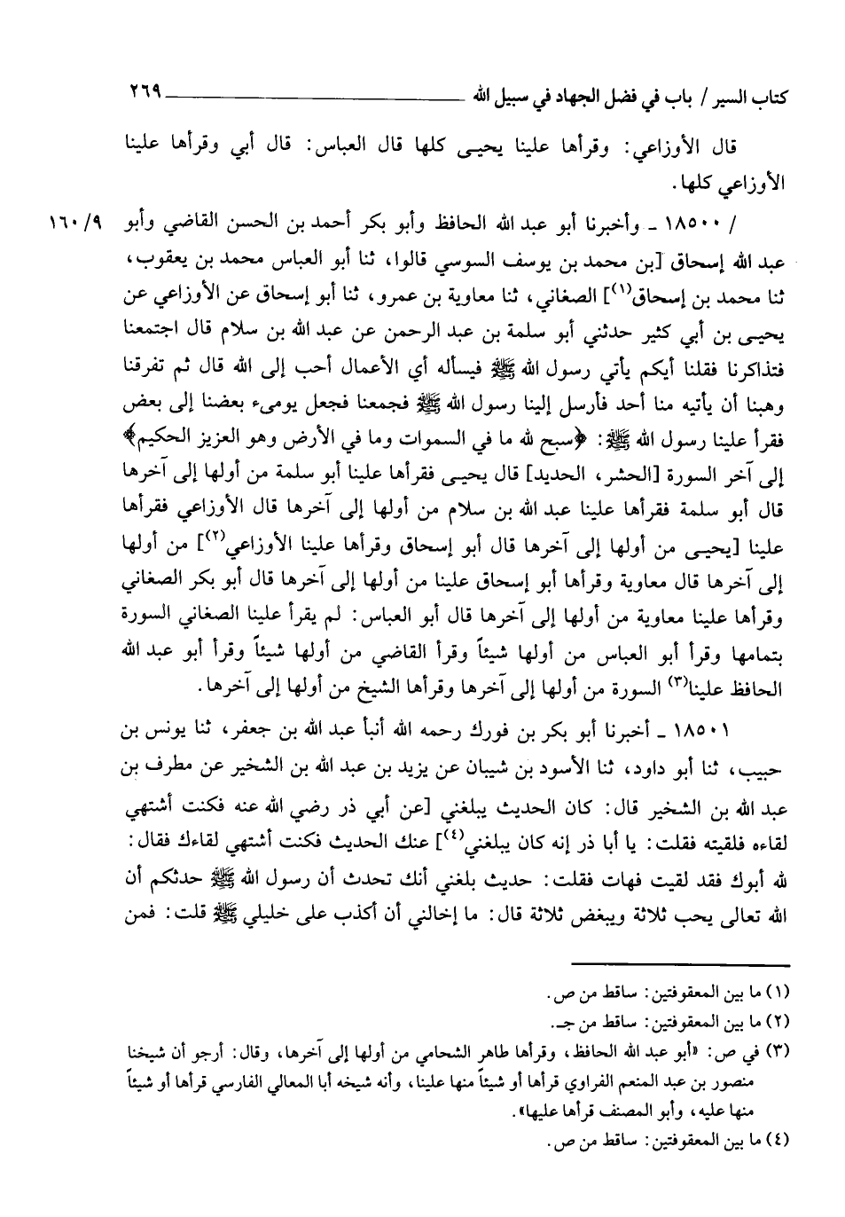 18500 - وَأَخْبَرَنَا أَبُو عَبْدِ اللهِ الْحَافِظُ، وَأَبُو بَكْرٍ أَحْمَدُ بْنُ الْحَسَنِ الْقَاضِي , وَأَبُو عَبْدِ اللهِ إِسْحَاقُ بْنُ مُحَمَّدِ بْنِ يُوسُفَ السُّوسِيُّ قَالُوا: ثنا أَبُو الْعَبَّاسِ مُحَمَّدُ بْنُ يَعْقُوبَ , ثنا مُحَمَّدُ بْنُ إِسْحَاقَ الصَّاغَانِيُّ، ثنا مُعَاوِيَةُ بْنُ عَمْرٍو، ثنا أَبُو إِسْحَاقَ، عَنِ الْأَوْزَاعِيِّ، عَنْ يَحْيَى بْنِ أَبِي كَثِيرٍ، حَدَّثَنِي أَبُو سَلَمَةَ بْنُ عَبْدِ الرَّحْمَنِ، عَنْ عَبْدِ اللهِ بْنِ سَلَامٍ، قَالَ: اجْتَمَعْنَا فَتَذَاكَرْنَا فَقُلْنَا: أَيُّكُمْ يَأْتِي رَسُولَ اللهِ صَلَّى اللهُ عَلَيْهِ وَسَلَّمَ فَيَسْأَلُهُ: §أِيُّ الْأَعْمَالِ أَحَبُّ إِلَى اللهِ؟ قَالَ: ثُمَّ تَفَرَّقْنَا وَهِبْنَا أَنْ يَأْتِيَهُ مِنَّا أَحَدٌ , فَأَرْسَلَ إِلَيْنَا رَسُولُ اللهِ صَلَّى اللهُ عَلَيْهِ وَسَلَّمَ فَجَمَعَنَا فَجَعَلَ يُومِئُ بَعْضُنَا إِلَى بَعْضٍ , فَقَرَأَ عَلَيْنَا رَسُولُ اللهِ صَلَّى اللهُ عَلَيْهِ وَسَلَّمَ: {سَبَّحَ لِلَّهِ مَا فِي السَّمَوَاتِ وَمَا فِي الْأَرْضِ وَهُوَ الْعَزِيزُ الْحَكِيمُ} إِلَى آخِرِ السُّورَةِ. قَالَ يَحْيَى: فَقَرَأَهَا عَلَيْنَا أَبُو سَلَمَةَ مِنْ أَوَّلِهَا إِلَى آخِرِهَا , قَالَ أَبُو سَلَمَةَ: فَقَرَأَهَا عَلَيْنَا عَبْدُ اللهِ بْنُ سَلَامٍ مِنْ أَوَّلِهَا إِلَى آخِرِهَا , قَالَ الْأَوْزَاعِيُّ: فَقَرَأَهَا عَلَيْنَا يَحْيَى مِنْ أَوَّلِهَا إِلَى آخِرِهَا , قَالَ أَبُو إِسْحَاقَ: وَقَرَأَهَا عَلَيْنَا الْأَوْزَاعِيُّ مِنْ أَوَّلِهَا إِلَى آخِرِهَا , قَالَ مُعَاوِيَةُ: وَقَرَأَهَا أَبُو إِسْحَاقَ عَلَيْنَا مِنْ أَوَّلِهَا إِلَى آخِرِهَا , قَالَ أَبُو بَكْرٍ الصَّغَانِيُّ: وَقَرَأَهَا عَلَيْنَا مُعَاوِيَةُ مِنْ أَوَّلِهَا إِلَى آخِرِهَا , قَالَ أَبُو الْعَبَّاسِ: لَمْ يَقْرَأْ عَلَيْنَا الصَّغَانِيُّ السُّورَةَ بِتَمَامِهَا , وَقَرَأَ أَبُو الْعَبَّاسِ مِنْ أَوَّلِهَا شَيْئًا , وَقَرَأَ الْقَاضِي مِنْ أَوَّلِهَا شَيْئًا , وَقَرَأَ أَبُو عَبْدِ اللهِ الْحَافِظُ عَلَيْنَا السُّورَةَ مِنْ أَوَّلِهَا إِلَى آخِرِهَا , وَقَرَأَهَا الشَّيْخُ مِنْ أَوَّلِهَا إِلَى آخِرِهَا