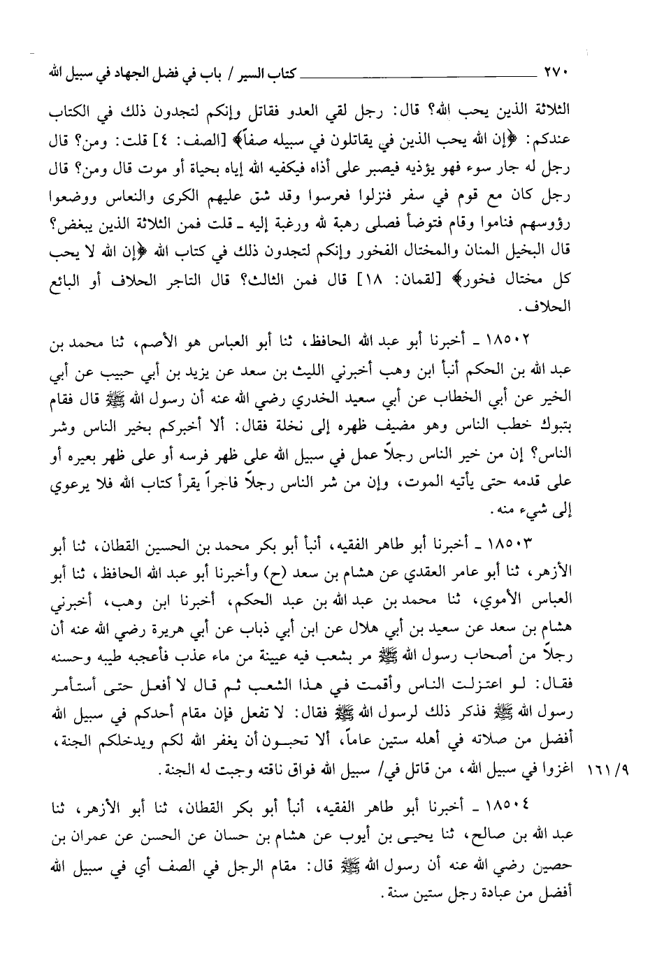 18502 - أَخْبَرَنَا أَبُو عَبْدِ اللهِ الْحَافِظُ، ثنا أَبُو الْعَبَّاسِ هُوَ الْأَصَمُّ , ثنا مُحَمَّدُ بْنُ عَبْدِ اللهِ بْنِ عَبْدِ الْحَكَمِ، أنبأ ابْنُ وَهْبٍ، أَخْبَرَنِي اللَّيْثُ بْنُ سَعْدٍ، عَنْ يَزِيدَ بْنِ أَبِي حَبِيبٍ، عَنْ أَبِي الْخَيْرِ، عَنْ أَبِي الْخَطَّابِ، عَنْ أَبِي سَعِيدٍ الْخُدْرِيِّ رَضِيَ اللهُ عَنْهُ أَنَّ رَسُولَ اللهِ صَلَّى اللهُ عَلَيْهِ وَسَلَّمَ قَالَ: فَقَامَ بِتَبُوكَ خَطَبَ النَّاسَ وَهُوَ مُضِيفٌ ظَهْرَهُ إِلَى نَخْلَةٍ فَقَالَ: " أَلَا أُخْبِرُكُمْ بِخَيْرِ النَّاسِ وَشَرِّ النَّاسِ؟ إِنَّ §مِنْ خَيْرِ النَّاسِ رَجُلًا عَمِلَ فِي سَبِيلِ اللهِ عَلَى ظَهْرِ فَرَسِهِ , أَوْ عَلَى ظَهْرِ بَعِيرِهِ , أَوْ عَلَى قَدَمِهِ حَتَّى يَأْتِيَهُ الْمَوْتُ , وَإِنَّ مِنْ شَرِّ النَّاسِ رَجُلًا فَاجِرًا يَقْرَأُ كِتَابَ اللهِ فَلَا يَرْعَوِي إِلَى شَيْءٍ مِنْهُ "