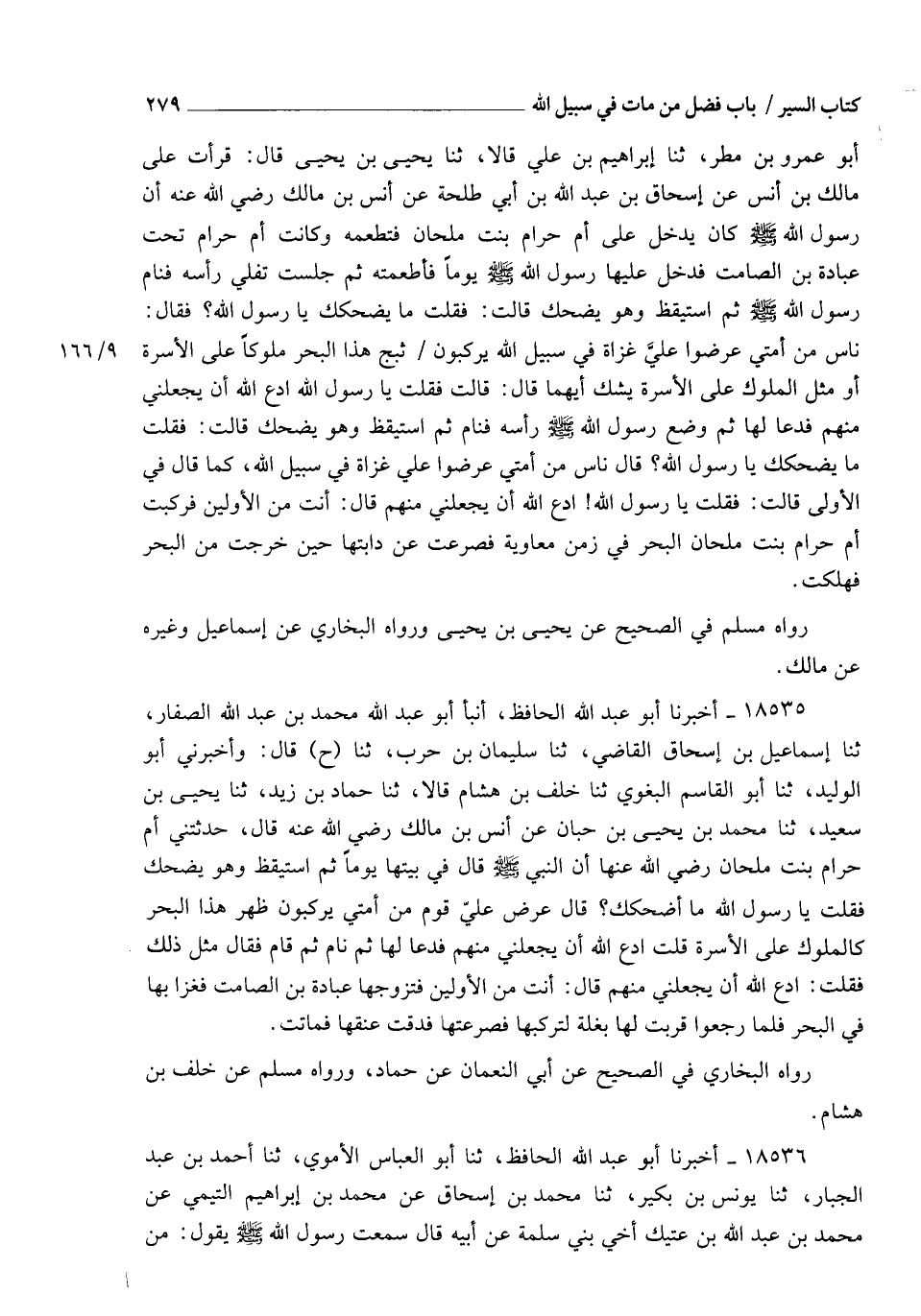 18535 - أَخْبَرَنَا أَبُو عَبْدِ اللهِ الْحَافِظُ، أنبأ أَبُو عَبْدِ اللهِ مُحَمَّدُ بْنُ عَبْدِ اللهِ الصَّفَّارُ , ثنا إِسْمَاعِيلُ بْنُ إِسْحَاقَ الْقَاضِي، ثنا سُلَيْمَانُ بْنُ حَرْبٍ، ثنا، ح، قَالَ: وَأَخْبَرَنِي أَبُو الْوَلِيدِ، ثنا أَبُو الْقَاسِمِ الْبَغَوِيُّ، ثنا خَلَفُ بْنُ هِشَامٍ، قَالَا: ثنا حَمَّادُ بْنُ زَيْدٍ، ثنا يَحْيَى بْنُ سَعِيدٍ، ثنا مُحَمَّدُ بْنُ يَحْيَى بْنِ حَبَّانَ، عَنْ أَنَسِ بْنِ مَالِكٍ رَضِيَ اللهُ عَنْهُ قَالَ: حَدَّثَتْنِي أَمُّ حَرَامٍ بِنْتُ مِلْحَانَ رَضِيَ اللهُ عَنْهَا أَنَّ النَّبِيَّ صَلَّى اللهُ عَلَيْهِ وَسَلَّمَ قَالَ فِي بَيْتِهَا يَوْمًا ثُمَّ اسْتَيْقَظَ وَهُوَ يَضْحَكُ , فَقُلْتُ: يَا رَسُولَ اللهِ مَا أَضْحَكَكَ؟ قَالَ: §" عُرِضَ عَلَيَّ قَوْمٌ مِنْ أُمَّتِي يَرْكَبُونَ ظَهْرَ هَذَا الْبَحْرِ كَالْمُلُوكِ عَلَى الْأَسِرَّةِ ". قُلْتُ: ادْعُ اللهَ أَنْ يَجْعَلَنِي مِنْهُمْ. فَدَعَا لَهَا ثُمَّ نَامَ , ثُمَّ قَامَ فَقَالَ مِثْلَ ذَلِكَ فَقُلْتُ: ادْعُ اللهَ أَنْ يَجْعَلَنِي مِنْهُمْ , قَالَ: " أَنْتِ مِنَ الْأَوَّلِينَ ". فَتَزَوَّجَهَا عُبَادَةُ بْنُ الصَّامِتِ , فَغَزَا بِهَا فِي الْبَحْرِ , فَلَمَّا رَجَعُوا قُرِّبَتْ لَهَا بَغْلَةٌ لِتَرْكَبَهَا , فَصَرَعَتْهَا فَدُقَّتْ عُنُقُهَا فَمَاتَتْ. رَوَاهُ الْبُخَارِيُّ فِي الصَّحِيحِ عَنْ أَبِي النُّعْمَانِ , عَنْ حَمَّادٍ , وَرَوَاهُ مُسْلِمٌ عَنْ خَلَفِ بْنِ هِشَامٍ