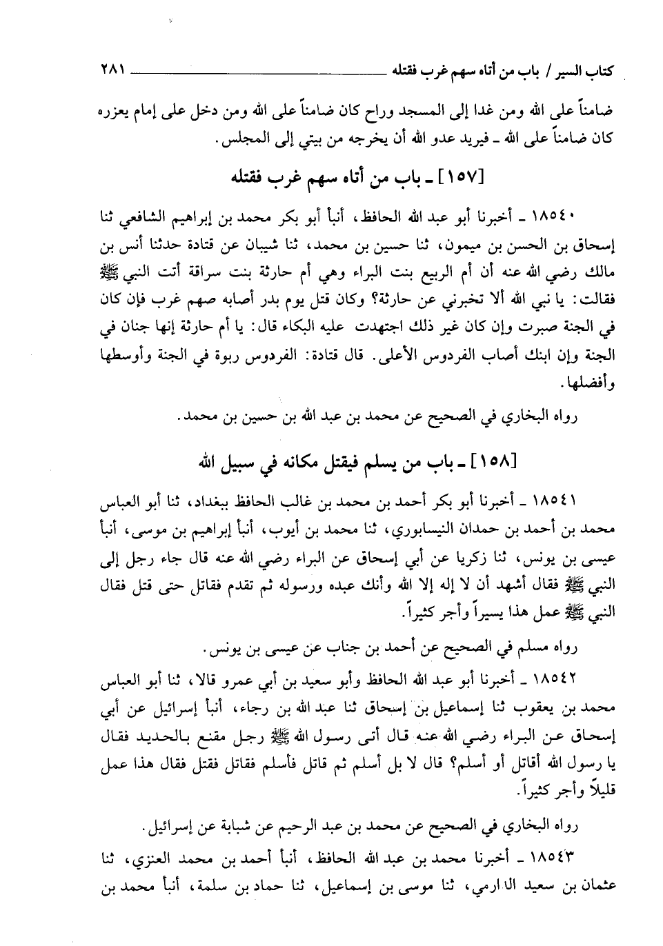 18540 - أَخْبَرَنَا أَبُو عَبْدِ اللهِ الْحَافِظُ، أنبأ أَبُو بَكْرٍ مُحَمَّدُ بْنُ عَبْدِ اللهِ بْنِ إِبْرَاهِيمَ الشَّافِعِيُّ , ثنا إِسْحَاقُ بْنُ الْحَسَنِ بْنِ مَيْمُونٍ، ثنا حُسَيْنُ بْنُ مُحَمَّدٍ، ثنا شَيْبَانُ، عَنْ قَتَادَةَ، حَدَّثَنَا أَنَسُ بْنُ مَالِكٍ رَضِيَ اللهُ عَنْهُ , أَنَّ أُمَّ الرُّبَيِّعِ بِنْتَ الْبَرَاءِ وَهِيَ أُمُّ حَارِثَةَ بِنْتُ سُرَاقَةَ , أَتَتِ النَّبِيَّ صَلَّى اللهُ عَلَيْهِ وَسَلَّمَ فَقَالَتْ: يَا نَبِيَّ اللهِ أَلَا تُخْبِرُنِي عَنْ حَارِثَةَ؟ وَكَانَ §قُتِلَ يَوْمَ بَدْرٍ , أَصَابَهُ سَهْمٌ غَرْبٌ , فَإِنْ كَانَ فِي الْجَنَّةِ صَبَرْتُ , وَإِنْ كَانَ غَيْرَ ذَلِكَ اجْتَهَدْتُ عَلَيْهِ الْبُكَاءَ. قَالَ: " يَا أُمَّ حَارِثَةَ إِنَّهَا جِنَانٌ فِي الْجَنَّةِ , وَإِنَّ ابْنَكِ أَصَابَ الْفِرْدَوْسَ الْأَعْلَى ". قَالَ قَتَادَةُ: الْفِرْدَوْسُ: رَبْوَةٌ فِي الْجَنَّةِ وَأَوْسَطُهَا وَأَفْضَلُهَا. رَوَاهُ الْبُخَارِيُّ فِي الصَّحِيحِ عَنْ مُحَمَّدِ بْنِ عَبْدِ اللهِ عَنْ حُسَيْنِ بْنِ مُحَمَّدٍ