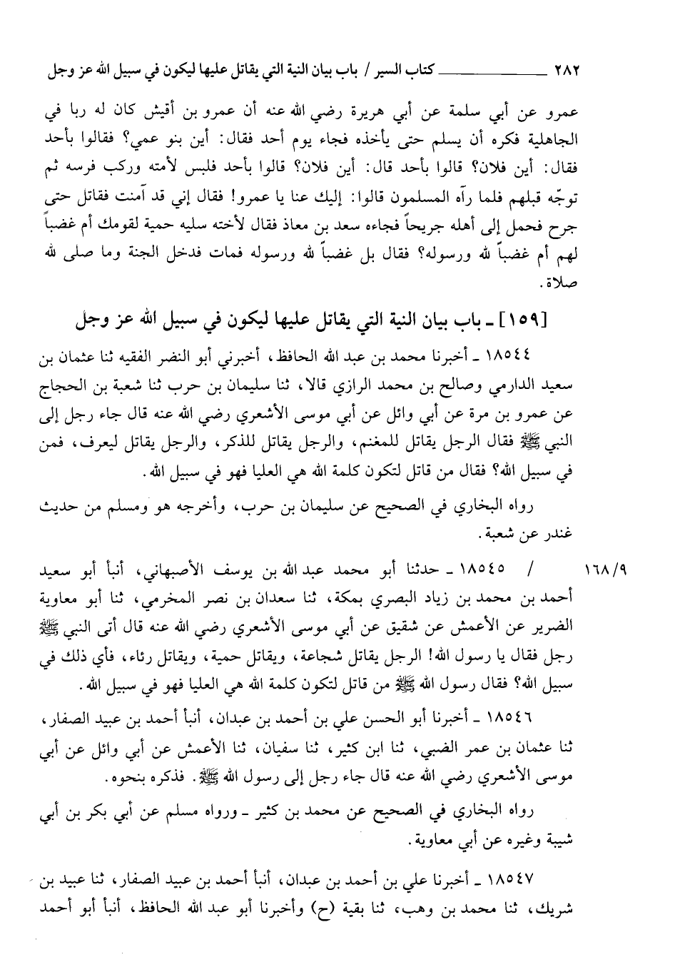 18545 - حَدَّثَنَا أَبُو مُحَمَّدٍ عَبْدُ اللهِ بْنُ يُوسُفَ الْأَصْبَهَانِيُّ، أنبأ أَبُو سَعِيدٍ أَحْمَدُ بْنُ مُحَمَّدِ بْنِ زِيَادٍ الْبَصْرِيُّ بِمَكَّةَ , ثنا سَعْدَانُ بْنُ نَصْرٍ الْمُخَرِّمِيُّ، ثنا أَبُو مُعَاوِيَةَ الضَّرِيرُ، عَنِ الْأَعْمَشِ، عَنْ شَقِيقٍ، عَنْ أَبِي مُوسَى الْأَشْعَرِيِّ رَضِيَ اللهُ عَنْهُ قَالَ: أَتَى النَّبِيَّ صَلَّى اللهُ عَلَيْهِ وَسَلَّمَ رَجُلٌ فَقَالَ: يَا رَسُولَ اللهِ الرَّجُلُ يُقَاتِلُ شَجَاعَةً , وَيُقَاتِلُ حَمِيَّةً , وَيُقَاتِلُ رِئَاءً , فَأِيُّ ذَلِكَ فِي سَبِيلِ اللهِ؟ فَقَالَ رَسُولُ اللهِ صَلَّى اللهُ عَلَيْهِ وَسَلَّمَ: §" مَنْ قَاتَلَ لِتَكُونَ كَلِمَةُ اللهِ هِيَ الْعُلْيَا , فَهُوَ فِي سَبِيلِ اللهِ "