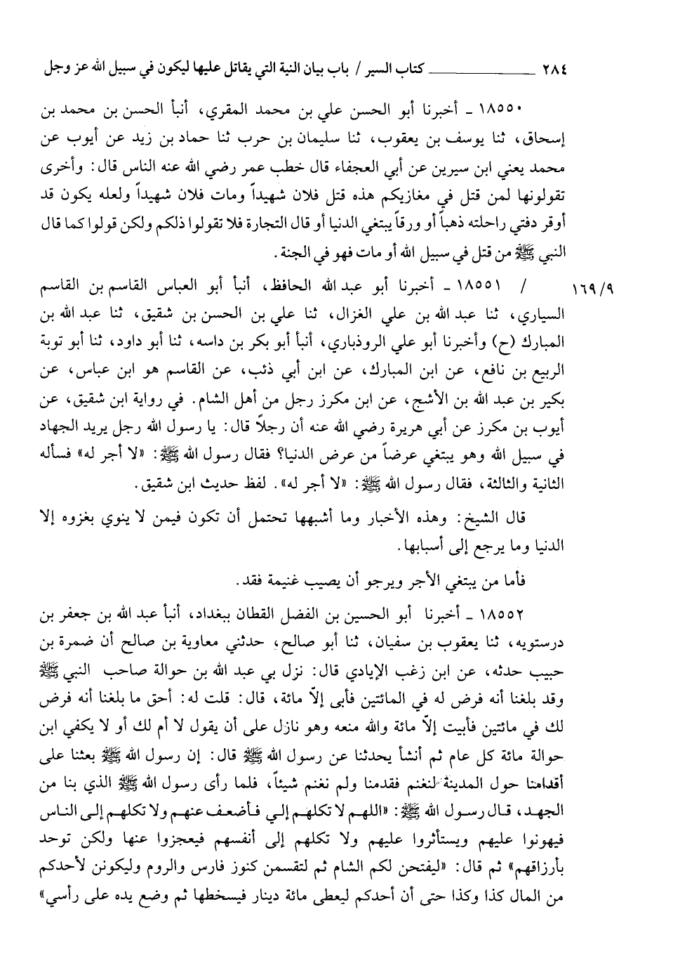 18551 - أَخْبَرَنَا أَبُو عَبْدِ اللهِ الْحَافِظُ، أنبأ أَبُو الْعَبَّاسِ الْقَاسِمُ بْنُ الْقَاسِمِ السَّيَّارِيُّ، ثنا عَبْدُ اللهِ بْنُ عَلِيٍّ الْغَزَّالُ، ثنا عَلِيُّ بْنُ الْحَسَنِ بْنِ شَقِيقٍ، ثنا عَبْدُ اللهِ بْنُ الْمُبَارَكِ، ح وَأَخْبَرَنَا أَبُو عَلِيٍّ الرُّوذْبَارِيُّ، أنبأ أَبُو بَكْرِ بْنُ دَاسَةَ، ثنا أَبُو دَاوُدَ، ثنا أَبُو تَوْبَةَ الرَّبِيعُ بْنُ نَافِعٍ، عَنِ ابْنِ الْمُبَارَكِ، عَنِ ابْنِ أَبِي ذِئْبٍ، عَنِ الْقَاسِمِ هُوَ ابْنُ عَبَّاسٍ , عَنْ بُكَيْرِ بْنِ عَبْدِ اللهِ بْنِ الْأَشَجِّ، عَنِ ابْنِ مِكْرَزٍ، رَجُلٌ مِنْ أَهْلِ الشَّامِ , وفِي رِوَايَةِ ابْنِ شَقِيقٍ، عَنْ أَيُّوبَ بْنِ مِكْرَزٍ، عَنْ أَبِي هُرَيْرَةَ رَضِيَ اللهُ عَنْهُ , أَنَّ رَجُلًا قَالَ: يَا رَسُولَ اللهِ، §رَجُلٌ يُرِيدُ الْجِهَادَ فِي سَبِيلِ اللهِ وَهُوَ يَبْتَغِي عَرَضًا مِنْ عَرَضِ الدُّنْيَا , فَقَالَ رَسُولُ اللهِ صَلَّى اللهُ عَلَيْهِ وَسَلَّمَ: " لَا أَجْرَ لَهُ " , فَسَأَلَهُ الثَّانِيَةَ وَالثَّالِثَةَ فَقَالَ رَسُولُ اللهِ صَلَّى اللهُ عَلَيْهِ وَسَلَّمَ: " لَا أَجْرَ لَهُ " لَفْظُ حَدِيثِ ابْنِ شَقِيقٍ , قَالَ الشَّيْخُ: وَهَذِهِ الْأَخْبَارُ وَمَا أَشْبَهَهَا تَحْتَمِلُ أَنْ تَكُونَ فِيمَنْ لَا يَنْوِي بِغَزْوِهِ إِلَّا الدُّنْيَا , وَمَا يَرْجِعُ إِلَى أَسْبَابِهَا , فَأَمَّا مَنْ يَبْتَغِي الْأَجْرَ وَيَرْجُو أَنْ يُصِيبَ غَنِيمَةً فَقَدْ