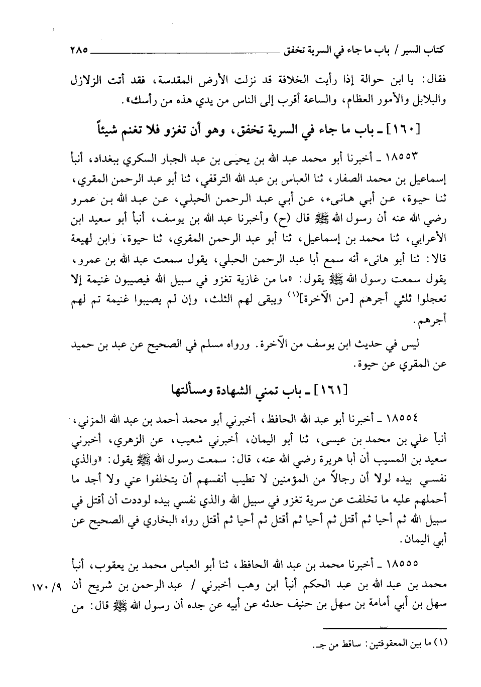 18553 - أَخْبَرَنَا أَبُو مُحَمَّدٍ عَبْدُ اللهِ بْنُ يَحْيَى بْنِ عَبْدِ الْجَبَّارِ السُّكَّرِيُّ بِبَغْدَادَ , أنبأ إِسْمَاعِيلُ بْنُ مُحَمَّدٍ الصَّفَّارُ، ثنا الْعَبَّاسُ بْنُ عَبْدِ اللهِ التَّرْقُفِيُّ، ثنا أَبُو عَبْدِ الرَّحْمَنِ الْمُقْرِئُ، ثنا حَيْوَةُ، عَنْ أَبِي هَانِئٍ، عَنْ أَبِي عَبْدِ الرَّحْمَنِ الْحُبُلِيِّ، عَنْ عَبْدِ اللهِ بْنِ عَمْرٍو رَضِيَ اللهُ عَنْهُ , أَنَّ رَسُولَ اللهِ صَلَّى اللهُ عَلَيْهِ وَسَلَّمَ قَالَ: ح وَأَخْبَرَنَا عَبْدُ اللهِ بْنُ يُوسُفَ , أنبأ أَبُو سَعِيدِ بْنُ الْأَعْرَابِيِّ , ثنا مُحَمَّدُ بْنُ إِسْمَاعِيلَ , ثنا أَبُو عَبْدِ الرَّحْمَنِ الْمُقْرِئُ , ثنا حَيْوَةُ وَابْنُ لَهِيعَةَ قَالَا: ثنا أَبُو هَانِئٍ أَنَّهُ سَمِعَ أَبَا عَبْدِ الرَّحْمَنِ الْحُبُلِيَّ يَقُولُ: سَمِعْتُ عَبْدَ اللهِ بْنَ عَمْرٍو يَقُولُ: سَمِعْتُ رَسُولَ اللهِ صَلَّى اللهُ عَلَيْهِ وَسَلَّمَ يَقُولُ: §" مَا مِنْ غَازِيَةٍ تَغْزُو فِي سَبِيلِ اللهِ فَيُصِيبُونَ غَنِيمَةً إِلَّا تَعَجَّلُوا ثُلُثَيْ أَجْرِهِمْ مِنَ الْآخِرَةِ وَيَبْقَى لَهُمُ الثُّلُثُ , وَإِنْ لَمْ يُصِيبُوا غَنِيمَةً تَمَّ لَهُمْ أَجْرُهُمْ ". لَيْسَ فِي حَدِيثِ ابْنِ يُوسُفَ " مِنَ الْآخِرَةِ "، رَوَاهُ مُسْلِمٌ فِي الصَّحِيحِ عَنْ عَبْدِ بْنِ حُمَيْدٍ، عَنِ الْمُقْرِئِ، عَنْ حَيْوَةَ