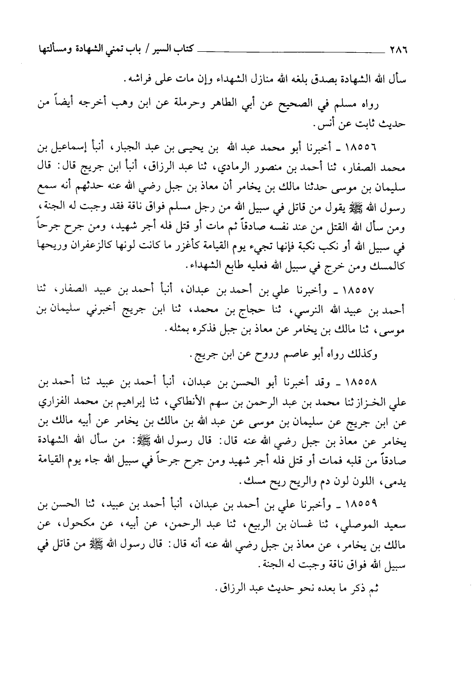 18556 - أَخْبَرَنَا أَبُو مُحَمَّدٍ عَبْدُ اللهِ بْنُ يَحْيَى بْنِ عَبْدِ الْجَبَّارِ، أنبأ إِسْمَاعِيلُ بْنُ مُحَمَّدٍ الصَّفَّارُ، ثنا أَحْمَدُ بْنُ مَنْصُورٍ الرَّمَادِيُّ، ثنا عَبْدُ الرَّزَّاقِ، أنبأ ابْنُ جُرَيْجٍ، قَالَ: قَالَ سُلَيْمَانُ بْنُ مُوسَى: حَدَّثَنَا مَالِكُ بْنُ يَخَامِرَ، أَنَّ مُعَاذَ بْنَ جَبَلٍ رَضِيَ اللهُ عَنْهُ حَدَّثَهُمْ أَنَّهُ سَمِعَ رَسُولَ اللهِ صَلَّى اللهُ عَلَيْهِ وَسَلَّمَ يَقُولُ: §" مَنْ قَاتَلَ فِي سَبِيلِ اللهِ مِنْ رَجُلٍ مُسْلِمٍ فُوَاقَ نَاقَةٍ فَقَدْ وَجَبَتْ لَهُ الْجَنَّةُ , وَمَنْ سَأَلَ اللهَ الْقَتْلَ مِنْ عِنْدِ نَفْسِهِ صَادِقًا ثُمَّ مَاتَ أَوْ قُتِلَ فَلَهُ أَجْرُ شَهِيدٍ , وَمَنْ جُرِحَ جُرْحًا فِي سَبِيلِ اللهِ أَوْ نُكِبَ نَكْبَةً فَإِنَّهَا تَجِيءُ يَوْمَ الْقِيَامَةِ كَأَغْزَرِ مَا كَانَتْ , لَوْنُهَا كَالزَّعْفَرَانِ وَرِيحُهَا كَالْمِسْكِ , وَمَنْ خَرَجَ فِي سَبِيلِ اللهِ فَعَلَيْهِ طَابَعُ الشُّهَدَاءِ ".