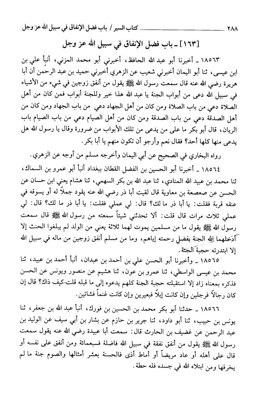 18563 - أَخْبَرَنَا أَبُو عَبْدِ اللهِ الْحَافِظُ، أَخْبَرَنِي أَبُو مُحَمَّدٍ الْمُزَنِيُّ، أنبأ عَلِيُّ بْنُ مُحَمَّد بْنُ عِيسَى، ثنا أَبُو الْيَمَانِ، أَخْبَرَنِي شُعَيْبٌ، عَنِ الزُّهْرِيِّ، أَخْبَرَنِي حُمَيْدُ بْنُ عَبْدِ الرَّحْمَنِ، أَنَّ أَبَا هُرَيْرَةَ رَضِيَ اللهُ عَنْهُ قَالَ: سَمِعْتُ رَسُولَ اللهِ صَلَّى اللهُ عَلَيْهِ وَسَلَّمَ يَقُولُ: §" مَنْ أَنْفَقَ زَوْجَيْنِ فِي شَيْءٍ مِنَ الْأَشْيَاءِ فِي سَبِيلِ اللهِ دُعِيَ مِنْ أَبْوَابِ الْجَنَّةِ يَا عَبْدَ اللهِ هَذَا خَيْرٌ , وَلِلْجَنَّةِ أَبْوَابٌ , فَمَنْ كَانَ مِنْ أَهْلِ الصَّلَاةِ دُعِيَ مِنْ بَابِ الصَّلَاةِ , وَمَنْ كَانَ مِنْ أَهْلِ الْجِهَادِ دُعِيَ مِنْ بَابِ الْجِهَادِ , وَمَنْ كَانَ مِنْ أَهْلِ الصَّدَقَةِ دُعِيَ مِنْ بَابِ الصَّدَقَةِ , وَمَنْ كَانَ مِنْ أَهْلِ الصِّيَامِ دُعِيَ مِنْ بَابِ الصِّيَامِ بَابِ الرَّيَّانِ ". قَالَ أَبُو بَكْرٍ: مَا عَلَى مَنْ يُدْعَى مِنْ تِلْكَ الْأَبْوَابِ مِنْ ضَرُورَةٍ , وَقَالَ: يَا رَسُولَ اللهِ هَلْ يُدْعَى مِنْهَا كُلِّهَا أَحَدٌ؟ فَقَالَ: " نَعَمْ , وَأَرْجُو أَنْ تَكُونَ مِنْهُمْ يَا أَبَا بَكْرٍ ". رَوَاهُ الْبُخَارِيُّ فِي الصَّحِيحِ عَنْ أَبِي الْيَمَانِ , وَأَخْرَجَهُ مُسْلِمٌ مِنْ أَوْجُهٍ عَنِ الزُّهْرِيِّ