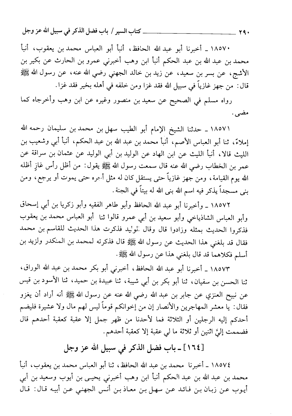 18570 - أَخْبَرَنَا أَبُو عَبْدِ اللهِ الْحَافِظُ، أنبأ أَبُو الْعَبَّاسِ مُحَمَّدُ بْنُ يَعْقُوبَ , أنبأ مُحَمَّدُ بْنُ عَبْدِ اللهِ بْنِ عَبْدِ الْحَكَمِ، أنبأ ابْنُ وَهْبٍ، أَخْبَرَنِي عَمْرُو بْنُ الْحَارِثِ، عَنْ بُكَيْرِ بْنِ الْأَشَجِّ، عَنْ بُسْرِ بْنِ سَعِيدٍ، عَنْ زَيْدِ بْنِ خَالِدٍ الْجُهَنِيِّ رَضِيَ اللهُ عَنْهُ , عَنْ رَسُولِ اللهِ صَلَّى اللهُ عَلَيْهِ وَسَلَّمَ قَالَ: §" مَنْ جَهَّزَ غَازِيًا فِي سَبِيلِ اللهِ فَقَدْ غَزَا , وَمَنْ خَلَفَهُ فِي أَهْلِهِ بِخَيْرٍ فَقَدْ غَزَا ". رَوَاهُ مُسْلِمٌ فِي الصَّحِيحِ عَنْ سَعِيدِ بْنِ مَنْصُورٍ وَغَيْرِهِ، عَنِ ابْنِ وَهْبٍ , وَأَخْرَجَاهُ كَمَا مَضَى