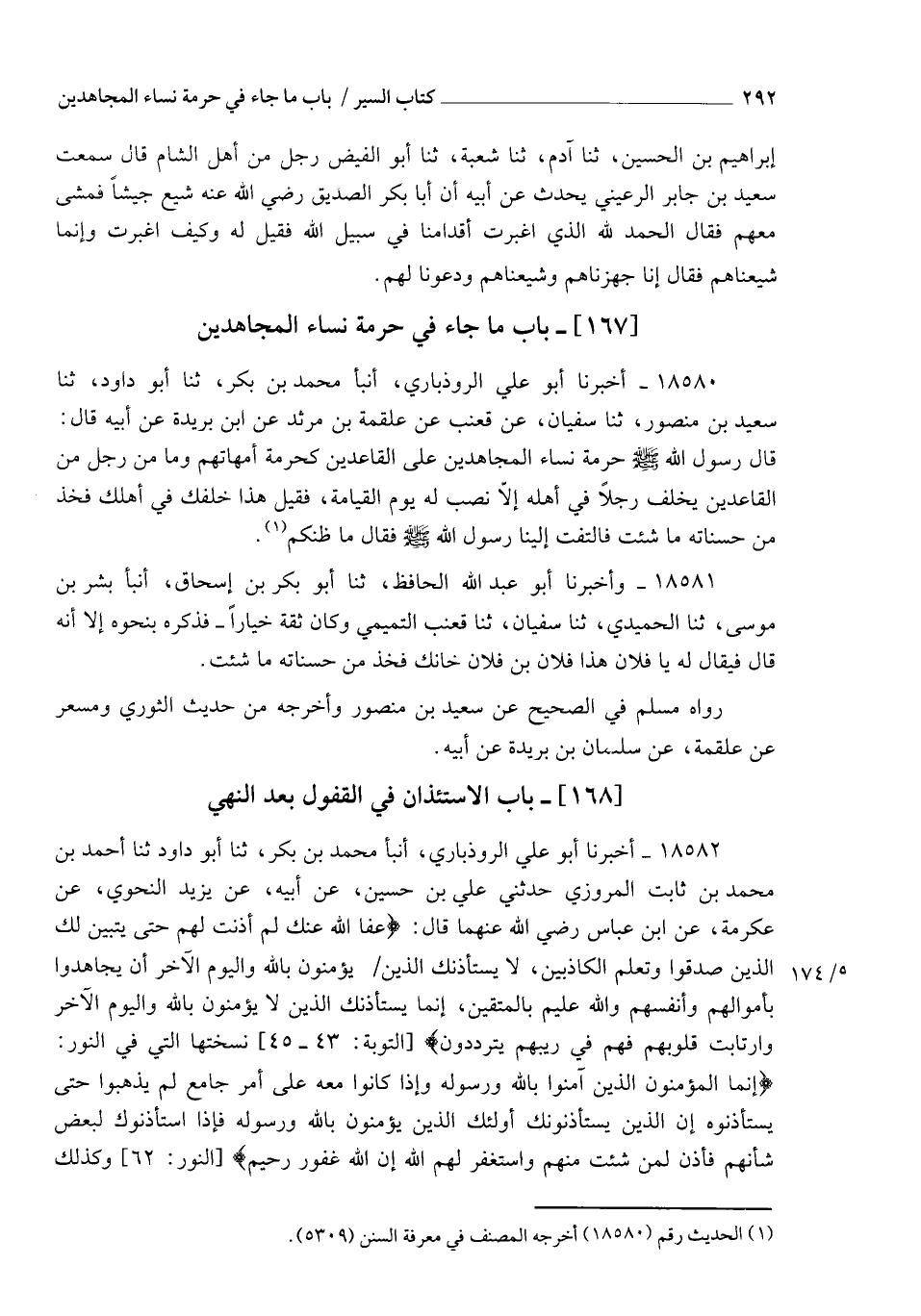18582 - أَخْبَرَنَا أَبُو عَلِيٍّ الرُّوذْبَارِيُّ، أنبأ مُحَمَّدُ بْنُ بَكْرٍ، ثنا أَبُو دَاوُدَ، ثنا أَحْمَدُ بْنُ مُحَمَّدِ بْنِ ثَابِتٍ الْمَرْوَزِيُّ، حَدَّثَنِي عَلِيُّ بْنُ حُسَيْنٍ، عَنْ أَبِيهِ، عَنْ يَزِيدَ النَّحْوِيِّ، عَنْ عِكْرِمَةَ، عَنِ ابْنِ عَبَّاسٍ رَضِيَ اللهُ عَنْهُمَا قَالَ: {§عَفَا اللهُ عَنْكَ لِمَ أَذِنْتَ لَهُمْ حَتَّى يَتَبَيَّنَ لَكَ الَّذِينَ صَدَقُوا وَتَعْلَمَ الْكَاذِبِينَ لَا يَسْتَأْذِنُكَ الَّذِينَ يُؤْمِنُونَ بِاللهِ وَالْيَوْمِ الْآخِرِ أَنْ يُجَاهِدُوا بِأَمْوَالِهِمْ وَأَنْفُسِهِمْ وَاللهُ عَلِيمٌ بِالْمُتَّقِينَ إِنَّمَا يَسْتَأْذِنُكَ الَّذِينَ لَا يُؤْمِنُونَ بِاللهِ وَالْيَوْمِ الْآخِرِ وَارْتَابَتْ قُلُوبُهُمْ فَهُمْ فِي رَيْبِهِمْ يَتَرَدَّدُونَ} [التوبة: 44]، نَسَخَتْهَا الَّتِي فِي النُّورِ: {إِنَّمَا الْمُؤْمِنُونَ الَّذِينَ آمَنُوا بِاللهِ وَرَسُولِهِ وَإِذَا كَانُوا مَعَهُ عَلَى أَمْرٍ جَامِعٍ لَمْ يَذْهَبُوا حَتَّى يَسْتَأْذِنُوهُ إِنَّ الَّذِينَ يَسْتَأْذِنُونَكَ أُولَئِكَ الَّذِينَ يُؤْمِنُونَ بِاللهِ وَرَسُولِهِ فَإِذَا اسْتَأْذَنُوكَ لِبَعْضِ شَأْنِهِمْ فَأْذَنْ لِمَنْ شِئْتَ مِنْهُمْ وَاسْتَغْفِرْ لَهُمُ اللهَ إِنَّ اللهَ غَفُورٌ رَحِيمٌ} [النور: 62]. وَكَذَلِكَ -[293]- رَوَاهُ عَطِيَّةُ بْنُ سَعْدٍ عَنِ ابْنِ عَبَّاسٍ. وَبِمَعْنَاهُ قَالَ قَتَادَةُ: قَالَ: رَخَّصَ لَهُ هَهُنَا بَعْدَمَا قَالَ لَهُ: {عَفَا اللهُ عَنْكَ لِمَ أَذِنْتَ لَهُمْ} [التوبة: 43]