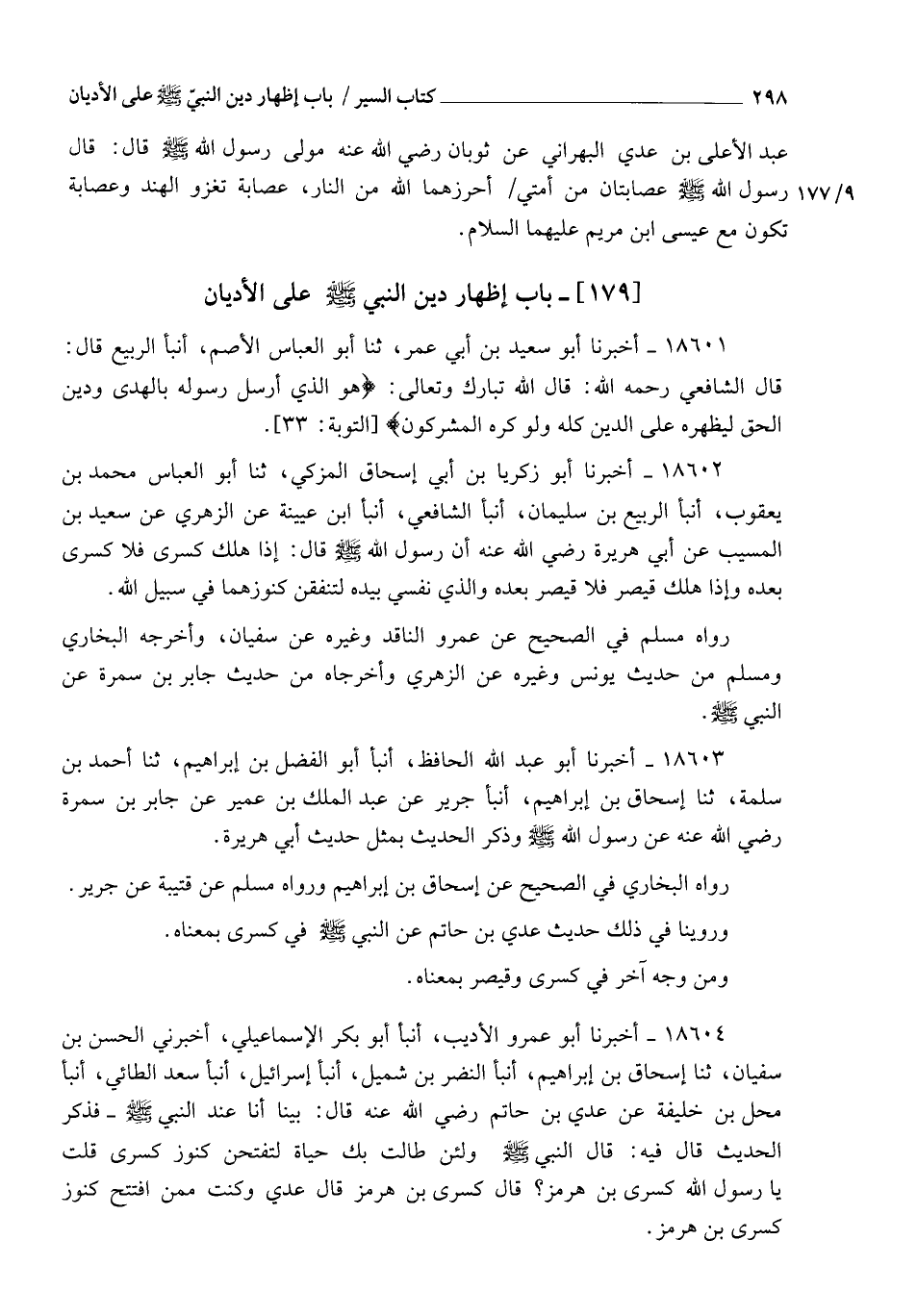 18603 - أَخْبَرَنَا أَبُو عَبْدِ اللهِ الْحَافِظُ، أنبأ أَبُو الْفَضْلِ بْنُ إِبْرَاهِيمَ، ثنا أَحْمَدُ بْنُ سَلَمَةَ، ثنا إِسْحَاقُ بْنُ إِبْرَاهِيمَ، أنبأ جَرِيرٌ، عَنْ عَبْدِ الْمَلِكِ بْنِ عُمَيْرٍ، عَنْ جَابِرِ بْنِ سَمُرَةَ رَضِيَ اللهُ عَنْهُ , عَنْ رَسُولِ اللهِ صَلَّى اللهُ عَلَيْهِ وَسَلَّمَ , وَذَكَرَ الْحَدِيثَ بِمِثْلِ حَدِيثِ أَبِي هُرَيْرَةَ. رَوَاهُ الْبُخَارِيُّ فِي الصَّحِيحِ عَنْ إِسْحَاقَ بْنِ إِبْرَاهِيمَ , وَرَوَاهُ مُسْلِمٌ عَنْ قُتَيْبَةَ , عَنْ جَرِيرٍ، وَرُوِّينَا فِي ذَلِكَ حَدِيثَ عَدِيِّ بْنِ حَاتِمٍ عَنِ النَّبِيِّ صَلَّى اللهُ عَلَيْهِ وَسَلَّمَ فِي كِسْرَى بِمَعْنَاهُ وَمَنْ وَجْهٍ آخَرَ فِي كِسْرَى وَقَيْصَرَ بِمَعْنَاهُ