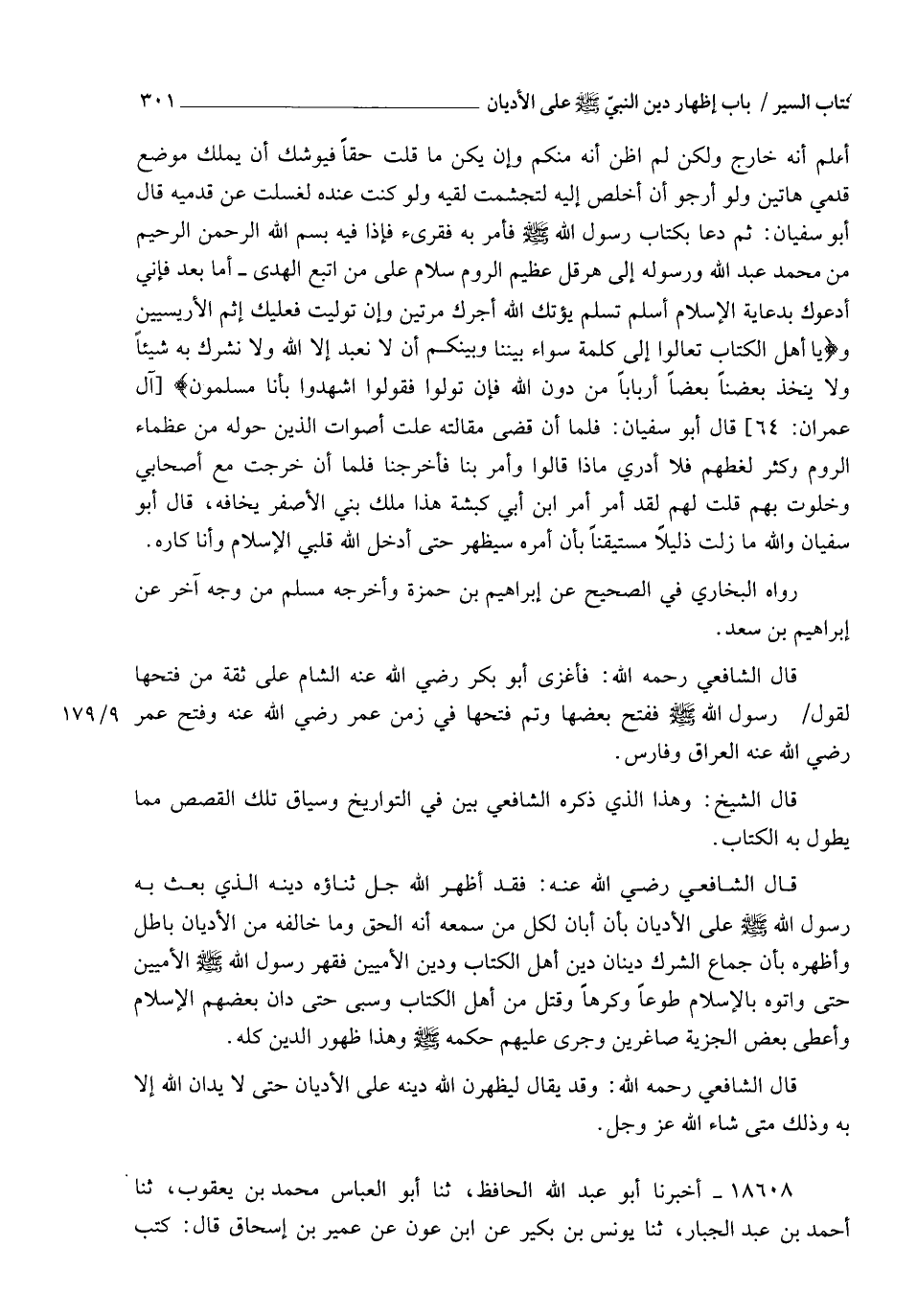18608 - أَخْبَرَنَا أَبُو عَبْدِ اللهِ الْحَافِظُ، ثنا أَبُو الْعَبَّاسِ مُحَمَّدُ بْنُ يَعْقُوبَ , ثنا أَحْمَدُ بْنُ عَبْدِ الْجَبَّارِ، ثنا يُونُسُ بْنُ بُكَيْرٍ، عَنِ ابْنِ عَوْنٍ، عَنْ عُمَيْرِ بْنِ إِسْحَاقَ، قَالَ: كَتَبَ -[302]- رَسُولُ اللهِ صَلَّى اللهُ عَلَيْهِ وَسَلَّمَ إِلَى كِسْرَى وَقَيْصَرَ , فَأَمَّا قَيْصَرُ فَوَضَعَهُ , وَأَمَّا كِسْرَى فَمَزَّقَهُ , فَبَلَغَ ذَلِكَ رَسُولَ اللهِ صَلَّى اللهُ عَلَيْهِ وَسَلَّمَ فَقَالَ: §" أَمَّا هَؤُلَاءِ فَيُمَزَّقُونَ , وَأَمَّا هَؤُلَاءِ فَسَتَكُونُ لَهُمْ بَقِيَّةٌ " قَالَ الشَّافِعِيُّ رَحِمَهُ اللهُ: وَوَعَدَ رَسُولُ اللهِ صَلَّى اللهُ عَلَيْهِ وَسَلَّمَ النَّاسَ فَتْحَ فَارِسَ وَالشَّامِ