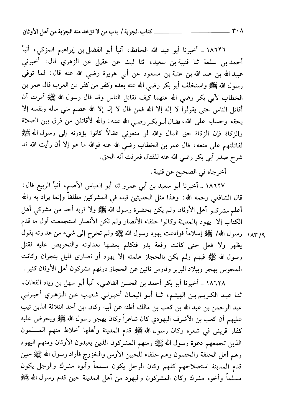 18627 - أَخْبَرَنَا أَبُو سَعِيدِ بْنُ أَبِي عَمْرٍو، ثنا أَبُو الْعَبَّاسِ الْأَصَمُّ , أَنْبَأَ الرَّبِيعُ، قَالَ: قَالَ الشَّافِعِيُّ رَحِمَهُ اللهُ: وَهَذَا مِثْلُ الْحَدِيثَيْنِ قَبْلَهُ فِي الْمُشْرِكِينَ مُطْلَقًا , وَإِنَّمَا يُرَادُ بِهِ وَاللهُ أَعْلَمُ مُشْرِكُو أَهْلِ الْأَوْثَانِ , وَلَمْ يَكُنْ بِحَضْرَةِ رَسُولِ اللهِ صَلَّى اللهُ عَلَيْهِ وَسَلَّمَ وَلَا قُرْبَهُ أَحَدٌ مِنْ مُشْرِكِي أَهْلِ الْكِتَابِ إِلَّا يَهُودُ بِالْمَدِينَةِ , وَكَانُوا حُلَفَاءَ الْأَنْصَارِ , وَلَمْ تَكُنِ الْأَنْصَارُ اسْتَجْمَعَتْ أَوَّلَ مَا قَدِمَ رَسُولُ اللهِ صَلَّى اللهُ عَلَيْهِ وَسَلَّمَ إِسْلَامًا , فَوَادَعَتْ يَهُودُ رَسُولَ اللهِ صَلَّى اللهُ عَلَيْهِ وَسَلَّمَ وَلَمْ تَخْرُجْ إِلَى شَيْءٍ مِنْ عَدَاوَتِهِ بِقَوْلٍ يَظْهَرُ وَلَا فِعْلٍ , حَتَّى كَانَتْ وَقْعَةُ بَدْرٍ فَتَكَلَّمَ بَعْضُهَا بِعَدَاوَتِهِ وَالتَّحْرِيضِ عَلَيْهِ , فَقَتَلَ رَسُولُ اللهِ صَلَّى اللهُ عَلَيْهِ وَسَلَّمَ فِيهِمْ , وَلَمْ يَكُنْ بِالْحِجَازِ عَلِمْتُهُ إِلَّا يَهُودُ أَوْ نَصَارَى قَلِيلٌ بِنَجْرَانَ , وَكَانَتِ الْمَجُوسُ بِهَجَرَ وَبِبِلَادِ الْبَرْبَرِ وَفَارِسَ نَائِينَ عَنِ الْحِجَازِ , دُونَهُمْ مُشْرِكُونَ أَهْلُ الْأَوْثَانِ كَثِيرٌ