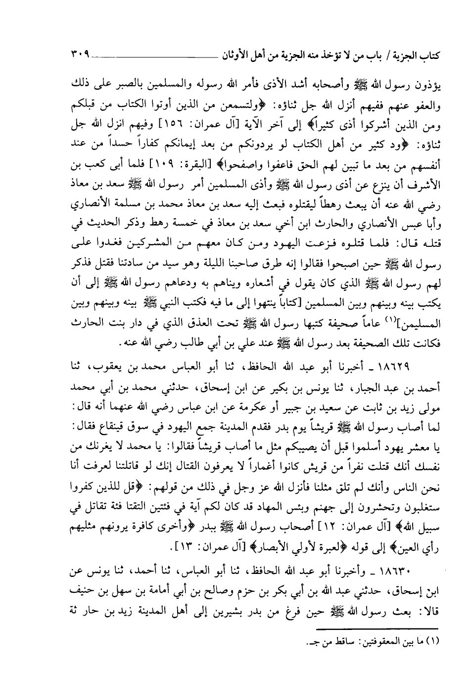 18630 - وَأَخْبَرَنَا أَبُو عَبْدِ اللهِ الْحَافِظُ، ثنا أَبُو الْعَبَّاسِ، ثنا أَحْمَدُ، ثنا يُونُسُ، عَنِ ابْنِ إِسْحَاقَ، حَدَّثَنِي عَبْدُ اللهِ بْنُ أَبِي بَكْرِ بْنِ حَزْمٍ، وَصَالِحُ بْنُ أَبِي أُمَامَةَ بْنِ سَهْلِ بْنِ حُنَيْفٍ، قَالَا: §بَعَثَ رَسُولُ اللهِ صَلَّى اللهُ عَلَيْهِ وَسَلَّمَ حِينَ فَرَغَ مِنْ بَدْرٍ بَشِيرَيْنِ إِلَى أَهْلِ الْمَدِينَةِ , زَيْدَ بْنَ حَارِثَةَ , -[310]- وَعَبْدَ اللهِ بْنَ رَوَاحَةَ , فَلَمَّا بَلَغَ ذَلِكَ كَعْبَ بْنَ الْأَشْرَفِ قَالَ: وَيْلَكَ أَحَقٌّ هَذَا؟ هَؤُلَاءِ مُلُوكُ الْعَرَبِ وَسَادَةُ النَّاسِ , يَعْنِي قَتْلَى قُرَيْشٍ , ثُمَّ خَرَجَ إِلَى مَكَّةَ فَجَعَلَ يَبْكِي عَلَى قَتْلَى قُرَيْشٍ وَيُحَرِّضُ عَلَى رَسُولِ اللهِ صَلَّى اللهُ عَلَيْهِ وَسَلَّمَ