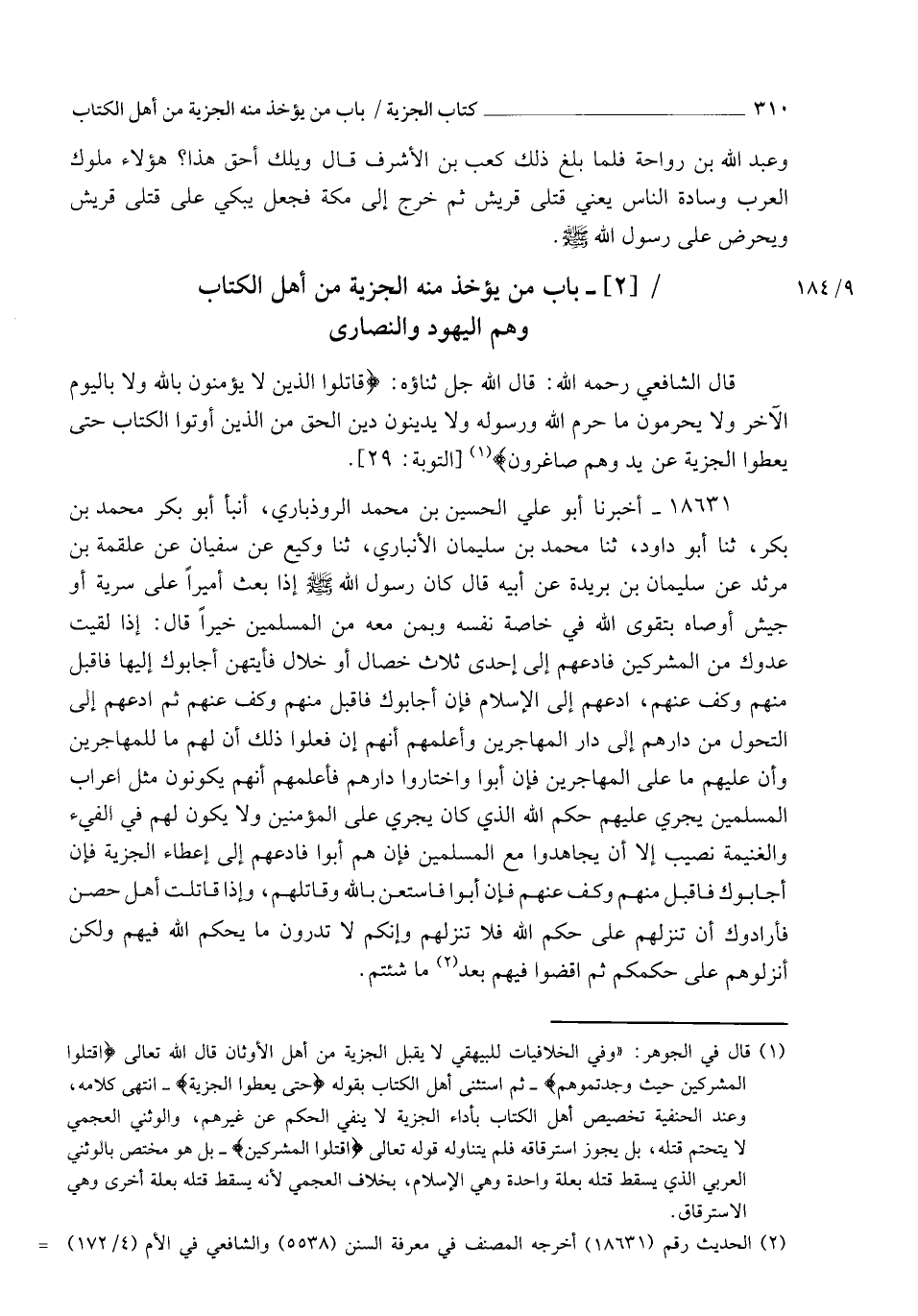 قَالَ الشَّافِعِيُّ رَحِمَهُ اللهُ: قَالَ اللهُ جَلَّ ثَنَاؤُهُ: {قَاتِلُوا الَّذِينَ لَا يُؤْمِنُونَ بِاللهِ وَلَا بِالْيَوْمِ الْآخِرِ وَلَا يُحَرِّمُونَ مَا حَرَّمَ اللهُ وَرَسُولُهُ وَلَا يَدِينُونَ دِينَ الْحَقِّ مِنَ الَّذِينَ أُوتُوا الْكِتَابَ حَتَّى يُعْطُوا الْجِزْيَةَ عَنْ يَدٍ وَهُمْ صَاغِرُونَ} [التوبة: 29].