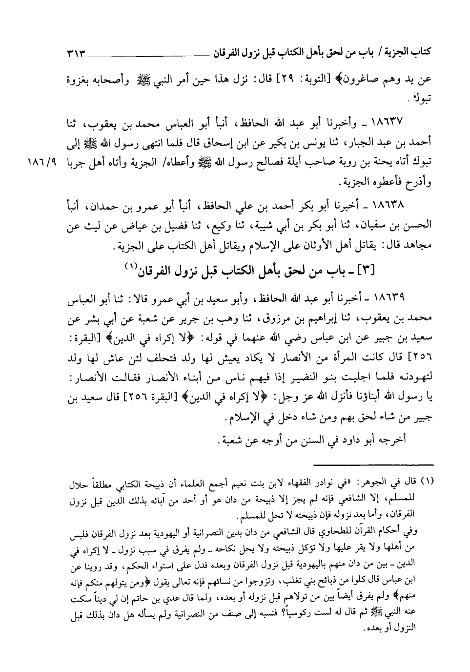 18639 - أَخْبَرَنَا أَبُو عَبْدِ اللهِ الْحَافِظُ، وَأَبُو سَعِيدِ بْنُ أَبِي عَمْرٍو قَالَا: ثنا أَبُو الْعَبَّاسِ مُحَمَّدُ بْنُ يَعْقُوبَ , ثنا إِبْرَاهِيمُ بْنُ مَرْزُوقٍ، ثنا وَهْبُ بْنُ جَرِيرٍ، عَنْ شُعْبَةَ، عَنْ أَبِي بِشْرٍ، عَنْ سَعِيدِ بْنِ جُبَيْرٍ، عَنِ ابْنِ عَبَّاسٍ رَضِيَ اللهُ عَنْهُمَا فِي قَوْلِهِ: {§لَا إِكْرَاهَ فِي الدِّينِ} [البقرة: 256] قَالَ: كَانَتِ الْمَرْأَةُ مِنَ الْأَنْصَارِ لَا يَكَادُ يَعِيشُ لَهَا وَلَدٌ فَتَحْلِفُ: لَئِنْ عَاشَ لَهَا وَلَدٌ لَتُهَوِّدَنَّهُ , فَلَمَّا أُجْلِيَتْ بَنُو النَّضِيرِ إِذَا فِيهِمْ نَاسٌ مِنْ أَبْنَاءِ الْأَنْصَارِ , فَقَالَتِ الْأَنْصَارُ: يَا رَسُولَ اللهِ أَبْنَاؤُنَا، فَأَنْزَلَ اللهُ عَزَّ وَجَلَّ: {لَا إِكْرَاهَ فِي الدِّينِ} [البقرة: 256]. قَالَ سَعِيدُ بْنُ جُبَيْرٍ: مَنْ شَاءَ لَحِقَ بِهِمْ وَمَنْ شَاءَ دَخَلَ فِي الْإِسْلَامِ. أَخْرَجَهُ أَبُو دَاوُدَ فِي السُّنَنِ مِنْ أَوْجُهٍ عَنْ شُعْبَةَ , -[314]- وَرَوَاهُ أَبُو عَوَانَةَ عَنْ أَبِي بِشْرٍ فَأَرْسَلَهُ