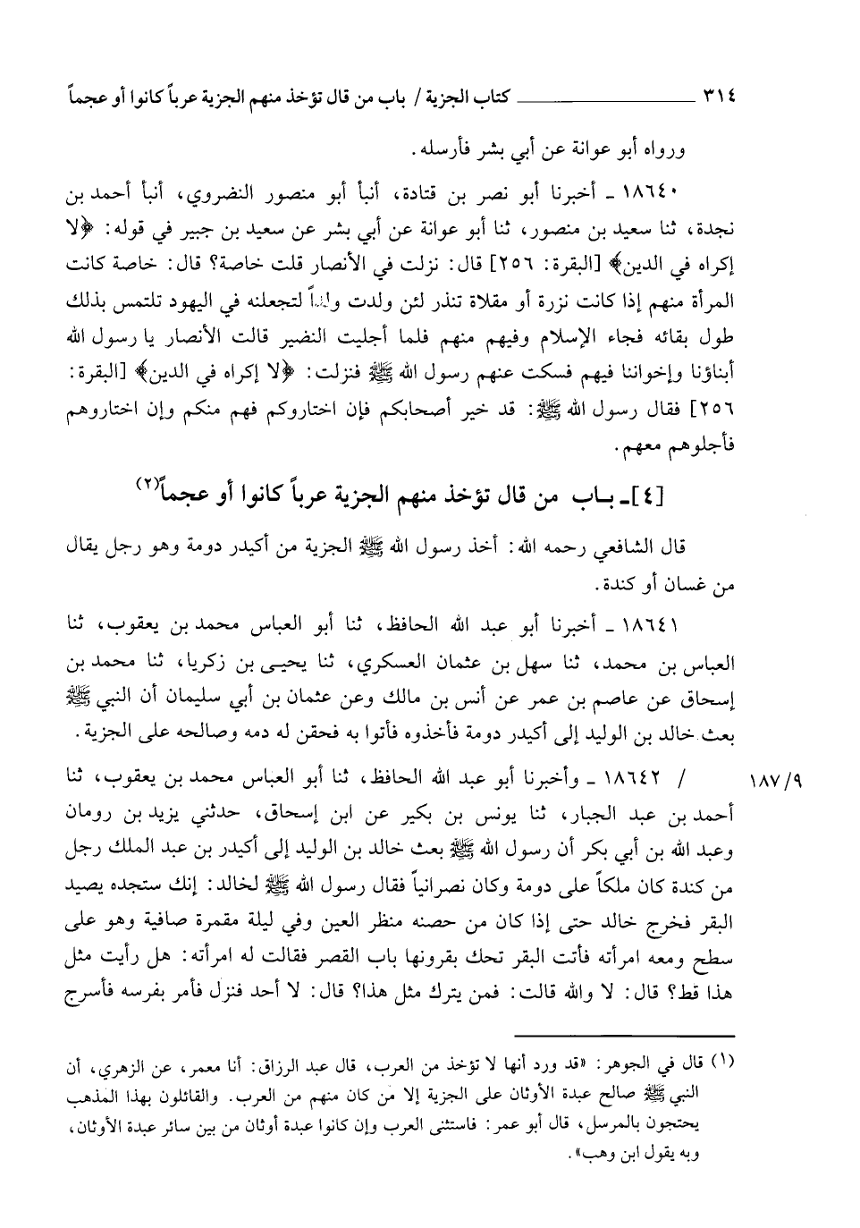 18642 - وَأَخْبَرَنَا أَبُو عَبْدِ اللهِ الْحَافِظُ، ثنا أَبُو الْعَبَّاسِ مُحَمَّدُ بْنُ يَعْقُوبَ , ثنا أَحْمَدُ بْنُ عَبْدِ الْجَبَّارِ، ثنا يُونُسُ بْنُ بُكَيْرٍ، عَنِ ابْنِ إِسْحَاقَ، حَدَّثَنِي يَزِيدُ بْنُ رُومَانَ، وَعَبْدُ اللهِ بْنُ أَبِي بَكْرٍ، أَنَّ رَسُولَ اللهِ صَلَّى اللهُ عَلَيْهِ وَسَلَّمَ بَعَثَ خَالِدَ بْنَ الْوَلِيدِ إِلَى أُكَيْدِرَ بْنِ عَبْدِ الْمَلِكِ , رَجُلٌ مِنْ كِنْدَةَ , كَانَ مَلِكًا عَلَى دُومَةَ , وَكَانَ نَصْرَانِيًّا , فَقَالَ رَسُولُ اللهِ صَلَّى اللهُ عَلَيْهِ وَسَلَّمَ لِخَالِدٍ: " إِنَّكَ §سَتَجِدُهُ يَصِيدُ الْبَقَرَ " , فَخَرَجَ خَالِدٌ حَتَّى إِذَا كَانَ مِنْ حِصْنِهِ مَنْظَرَ الْعَيْنِ , وَفِي لَيْلَةٍ مُقْمِرَةٍ صَافِيَةٍ وَهُوَ عَلَى سَطْحٍ وَمَعَهُ امْرَأَتُهُ , فَأَتَتِ الْبَقَرُ تَحُكُّ بِقُرُونِهَا بَابَ الْقَصْرِ , فَقَالَتْ لَهُ امْرَأَتُهُ: هَلْ رَأَيْتَ مِثْلَ هَذَا قَطُّ؟ قَالَ: لَا وَاللهِ , قَالَتْ: فَمَنْ يَتْرُكُ مِثْلَ هَذَا؟ قَالَ: لَا أَحَدَ , فَنَزَلَ فَأَمَرَ بِفَرَسِهِ فَأُسْرِجَ -[315]- وَرَكِبَ مَعَهُ نَفَرٌ مِنْ أَهْلِ بَيْتِهِ , فِيهِمْ أَخٌ لَهُ يُقَالُ لَهُ حَسَّانُ , فَخَرَجُوا مَعَهُ بِمَطَارِفِهِمْ , فَتَلَقَّاهُمْ خَيْلُ رَسُولِ اللهِ صَلَّى اللهُ عَلَيْهِ وَسَلَّمَ فَأَخَذَتْهُ وَقَتَلُوا أَخَاهُ حَسَّانَ , وَكَانَ عَلَيْهِ قُبَاءُ دِيبَاجٍ مَخُوصٍ بِالذَّهَبِ , فَاسْتَلَبَهُ إِيَّاهُ خَالِدُ بْنُ الْوَلِيدِ , فَبَعَثَ بِهِ إِلَى رَسُولِ اللهِ صَلَّى اللهُ عَلَيْهِ وَسَلَّمَ قَبْلَ قُدُومِهِ عَلَيْهِ , ثُمَّ إِنَّ خَالِدًا قَدِمَ بِالْأُكَيْدِرِ عَلَى رَسُولِ اللهِ صَلَّى اللهُ عَلَيْهِ وَسَلَّمَ فَحَقَنَ لَهُ دَمَهُ وَصَالَحَهُ عَلَى الْجِزْيَةِ وَخَلَّى سَبِيلَهُ , فَرَجَعَ إِلَى قَرْيَتِهِ قَالَ الشَّافِعِيُّ رَحِمَهُ اللهُ: وَأَخَذَ رَسُولُ اللهِ صَلَّى اللهُ عَلَيْهِ وَسَلَّمَ الْجِزْيَةَ مِنْ أَهْلِ ذِمَّةِ الْيَمَنِ , وَعَامَّتُهُمْ عَرَبٌ , وَمَنْ أَهْلِ نَجْرَانَ وَفِيهِمْ عَرَبٌ