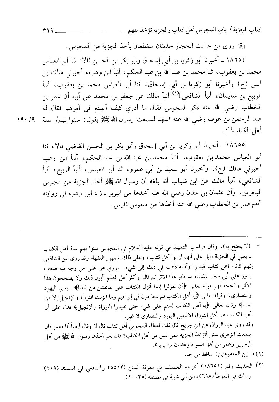 18654 - أَخْبَرَنَا أَبُو زَكَرِيَّا بْنُ أَبِي إِسْحَاقَ، وَأَبُو بَكْرِ بْنُ الْحَسَنِ قَالَا: ثنا أَبُو الْعَبَّاسِ مُحَمَّدُ بْنُ يَعْقُوبَ , ثنا مُحَمَّدُ بْنُ عَبْدِ اللهِ بْنِ عَبْدِ الْحَكَمِ، أنبأ ابْنُ وَهْبٍ، أَخْبَرَنِي مَالِكُ بْنُ أَنَسٍ، ح وَأَخْبَرَنَا أَبُو زَكَرِيَّا بْنُ أَبِي إِسْحَاقَ، ثنا أَبُو الْعَبَّاسِ مُحَمَّدُ بْنُ يَعْقُوبَ , أنبأ الرَّبِيعُ بْنُ سُلَيْمَانَ، أنبأ الشَّافِعِيُّ، أنبأ مَالِكٌ، عَنْ جَعْفَرِ بْنِ مُحَمَّدٍ، عَنْ أَبِيهِ، أَنَّ عُمَرَ بْنَ الْخَطَّابِ رَضِيَ اللهُ عَنْهُ ذَكَرَ الْمَجُوسَ فَقَالَ: مَا أَدْرِي كَيْفَ أَصْنَعُ فِي أَمْرِهِمْ , فَقَالَ لَهُ عَبْدُ الرَّحْمَنِ بْنُ عَوْفٍ رَضِيَ اللهُ عَنْهُ: أَشْهَدُ لَسَمِعْتُ رَسُولَ اللهِ صَلَّى اللهُ عَلَيْهِ وَسَلَّمَ يَقُولُ: §" سُنُّوا بِهِمْ سُنَّةَ أَهْلِ الْكِتَابِ "