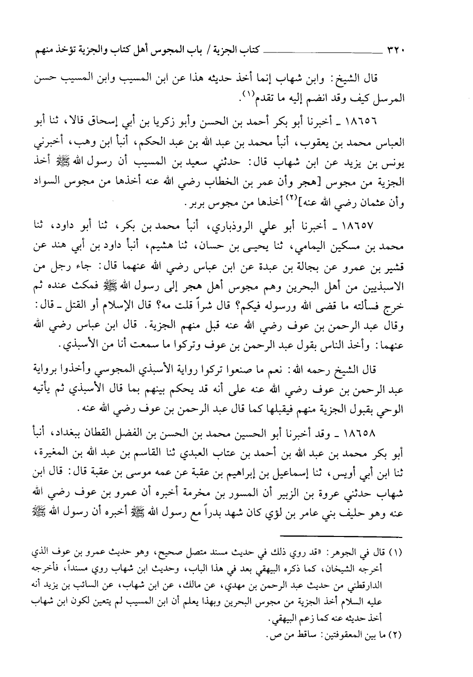 18657 - أَخْبَرَنَا أَبُو عَلِيٍّ الرُّوذْبَارِيُّ، أنبأ مُحَمَّدُ بْنُ بَكْرٍ، ثنا أَبُو دَاوُدَ، ثنا مُحَمَّدُ بْنُ مِسْكِينٍ الْيَمَامِيُّ، ثنا يَحْيَى بْنُ حَسَّانَ، ثنا هُشَيْمٌ، أنبأ دَاوُدُ بْنُ أَبِي هِنْدَ، عَنْ قُشَيْرِ بْنِ عَمْرٍو، عَنْ بَجَالَةَ بْنِ عَبْدَةَ، عَنِ ابْنِ عَبَّاسٍ رَضِيَ اللهُ عَنْهُمَا قَالَ: §جَاءَ رَجُلٌ مِنَ الْأَسْبَذِيِّينَ مِنْ أَهْلِ الْبَحْرَيْنِ وَهُمْ مَجُوسُ أَهْلِ هَجَرَ إِلَى رَسُولِ اللهِ صَلَّى اللهُ عَلَيْهِ وَسَلَّمَ فَمَكَثَ عِنْدَهُ ثُمَّ خَرَجَ , فَسَأَلْتُهُ مَا قَضَى اللهُ وَرَسُولُهُ فِيكُمْ؟ قَالَ: شَرًّا. قُلْتُ: مَهْ؟ قَالَ: الْإِسْلَامُ أَوِ الْقَتْلُ. قَالَ: وَقَالَ عَبْدُ الرَّحْمَنِ بْنُ عَوْفٍ رَضِيَ اللهُ عَنْهُ: قَبِلَ مِنْهُمُ الْجِزْيَةَ. قَالَ ابْنُ عَبَّاسٍ رَضِيَ اللهُ عَنْهُمَا: وَأَخَذَ النَّاسُ بِقَوْلِ عَبْدِ الرَّحْمَنِ بْنِ عَوْفٍ وَتَرَكُوا مَا سَمِعْتُ أَنَا مِنَ الْأَسْبَذِيِّ. قَالَ الشَّيْخُ رَحِمَهُ اللهُ: نِعْمَ مَا صَنَعُوا , تَرَكُوا رِوَايَةَ الْأَسْبَذِيِّ الْمَجُوسِيِّ , وَأَخَذُوا بِرِوَايَةِ عَبْدِ الرَّحْمَنِ بْنِ عَوْفٍ رَضِيَ اللهُ عَنْهُ عَلَى أَنَّهُ قَدْ يَحْكُمُ بَيْنَهُمْ بِمَا قَالَ الْأَسْبَذِيُّ , ثُمَّ يَأْتِيهِ الْوَحْيُ بِقَبُولِ الْجِزْيَةِ مِنْهُمْ فَيَقْبَلُهَا كَمَا قَالَ عَبْدُ الرَّحْمَنِ بْنُ عَوْفٍ رَضِيَ اللهُ عَنْهُ