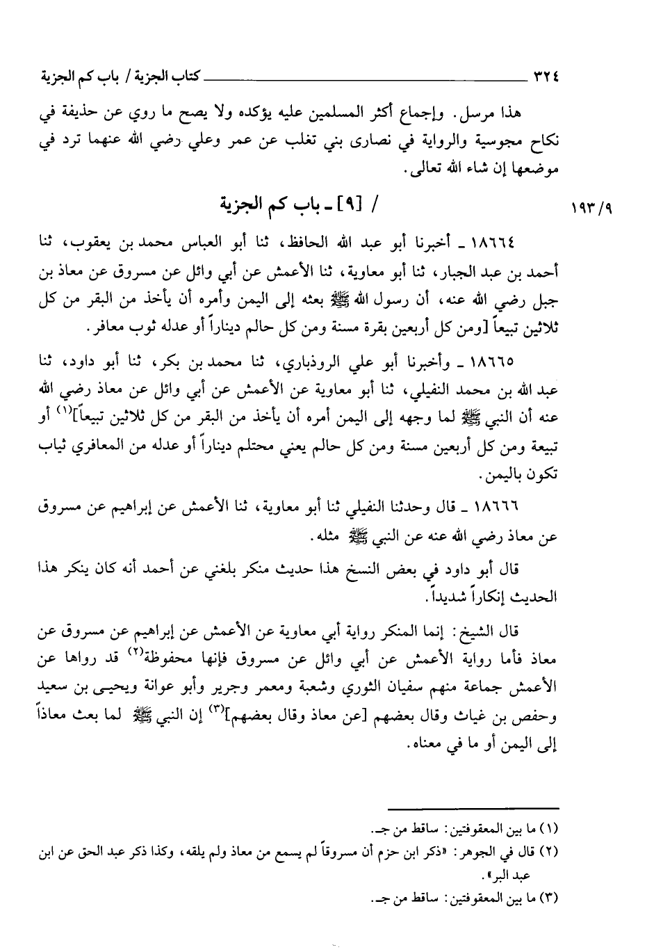 18665 - وَأَخْبَرَنَا أَبُو عَلِيٍّ الرُّوذْبَارِيُّ، ثنا مُحَمَّدُ بْنُ بَكْرٍ، ثنا أَبُو دَاوُدَ، ثنا عَبْدُ اللهِ بْنُ مُحَمَّدٍ النُّفَيْلِيُّ، ثنا أَبُو مُعَاوِيَةَ، عَنِ الْأَعْمَشِ، عَنْ أَبِي وَائِلٍ، عَنْ مُعَاذٍ رَضِيَ اللهُ عَنْهُ , أَنَّ النَّبِيَّ صَلَّى اللهُ عَلَيْهِ وَسَلَّمَ لَمَّا وَجَّهَهُ إِلَى الْيَمَنِ §أَمَرَهُ أَنْ يَأْخُذَ مِنَ الْبَقَرِ مِنْ كُلِّ ثَلَاثِينَ تَبِيعًا أَوْ تَبِيعَةً , وَمِنْ كُلِّ أَرْبَعِينَ مُسِنَّةً , وَمِنْ كُلِّ حَالِمٍ , يَعْنِي مُحْتَلِمًا , دِينَارًا أَوْ عِدْلَهُ مِنَ الْمَعَافِرِيِّ ثِيَابٌ تَكُونُ بِالْيَمَنِ.