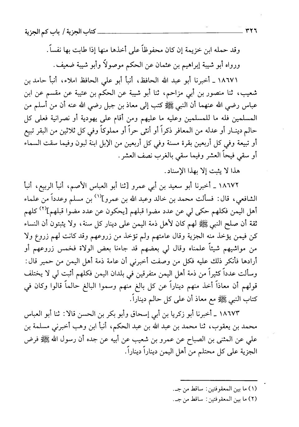 18671 - أَخْبَرَنَا أَبُو عَبْدِ اللهِ الْحَافِظُ، أَنْبَأَ أَبُو عَلِيٍّ الْحَافِظُ إِمْلَاءً , أنبأ حَامِدُ بْنُ شُعَيْبٍ، ثنا مَنْصُورُ بْنُ أَبِي مُزَاحِمٍ، ثنا أَبُو شَيْبَةَ، عَنِ الْحَكَمِ بْنِ عُتَيْبَةَ، عَنْ مِقْسَمٍ، عَنِ ابْنِ عَبَّاسٍ رَضِيَ اللهُ عَنْهُمَا , أَنَّ النَّبِيَّ صَلَّى اللهُ عَلَيْهِ وَسَلَّمَ كَتَبَ إِلَى مُعَاذِ بْنِ جَبَلٍ رَضِيَ اللهُ عَنْهُ أَنَّ §" مَنْ أَسْلَمَ مِنَ الْمُسْلِمِينَ فَلَهُ مَا لِلْمُسْلِمِينَ وَعَلَيْهِ مَا عَلَيْهِمْ , وَمَنْ أَقَامَ عَلَى يَهُودِيَّةٍ أَوْ نَصْرَانِيَّةٍ فَعَلَى كُلِّ حَالِمٍ دِينَارٌ أَوْ عِدْلُهُ مِنَ الْمَعَافِرِ , ذَكَرًا أَوْ أُنْثَى , حُرًّا أَوْ مَمْلُوكًا , وَفِي كُلِّ ثَلَاثِينَ مِنَ الْبَقَرِ تَبِيعٌ أَوْ تَبِيعَةٌ , وَفِي كُلِّ أَرْبَعِينَ بَقَرَةٌ مُسِنَّةٌ , وَفِي كُلِّ أَرْبَعِينَ مِنَ الْإِبِلِ ابْنَةُ لَبُونٍ , وَفِيمَا سَقَتِ السَّمَاءُ أَوْ سُقِيَ فَيْحًا الْعُشْرُ , وَفِيمَا سُقِيَ بِالْغَرْبِ نِصْفُ الْعُشْرِ ". هَذَا لَا يَثْبُتُ إِلَّا بِهَذَا الْإِسْنَادِ