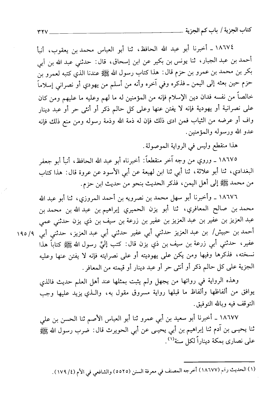 18674 - أَخْبَرَنَا أَبُو عَبْدِ اللهِ الْحَافِظُ، ثنا أَبُو الْعَبَّاسِ مُحَمَّدُ بْنُ يَعْقُوبَ , أنبأ أَحْمَدُ بْنُ عَبْدِ الْجَبَّارِ، ثنا يُونُسُ بْنُ بُكَيْرٍ، عَنِ ابْنِ إِسْحَاقَ، قَالَ: حَدَّثَنِي عَبْدُ اللهِ بْنُ أَبِي بَكْرِ بْنِ مُحَمَّدِ بْنِ عَمْرِو بْنِ حَزْمٍ، قَالَ: هَذَا كِتَابُ رَسُولِ اللهِ صَلَّى اللهُ عَلَيْهِ وَسَلَّمَ عِنْدَنَا الَّذِي كَتَبَهُ لِعَمْرِو بْنِ حَزْمٍ حِينَ بَعَثَهُ إِلَى الْيَمَنِ , فَذَكَرَهُ وَفِي آخِرِهِ " وَأَنَّهُ §مَنْ أَسْلَمَ مِنْ يَهُودِيٍّ أَوْ نَصْرَانِيٍّ إِسْلَامًا خَالِصًا مِنْ نَفْسِهِ فَدَانَ دِينَ الْإِسْلَامِ فَإِنَّهُ مِنَ الْمُؤْمِنِينَ , لَهُ مَا لَهُمْ , وَعَلَيْهِ مَا عَلَيْهِمْ , وَمَنْ كَانَ عَلَى نَصْرَانِيَّةٍ أَوْ يَهُودِيَّةٍ فَإِنَّهُ لَا يُفْتَنُ عَنْهَا , وَعَلَى كُلِّ حَالِمٍ , ذَكَرٍ أَوْ أُنْثَى , حُرٍّ أَوْ عَبْدٍ دِينَارٌ وَافٍ , أَوْ عَرْضُهُ مِنَ الثِّيَابِ , فَمَنْ أَدَّى ذَلِكَ فَإِنَّ لَهُ ذِمَّةَ اللهِ وَذِمَّةَ رَسُولِهِ , وَمَنْ مَنَعَ ذَلِكَ فَإِنَّهُ عَدُوُّ اللهِ وَرَسُولِهِ وَالْمُؤْمِنِينَ ". هَذَا مُنْقَطِعٌ وَلَيْسَ فِي الرِّوَايَةِ الْمَوْصُولَةِ