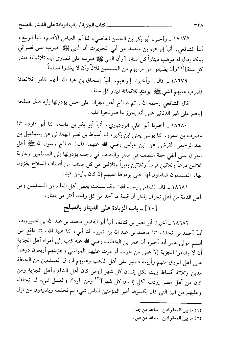18679 - قَالَ: وَأَخْبَرَنَا إِبْرَاهِيمُ، أَنْبَأَ إِسْحَاقُ بْنُ عَبْدِ اللهِ، أَنَّهُمْ كَانُوا ثَلَاثَمِائَةٍ , فَضَرَبَ عَلَيْهِمُ النَّبِيُّ صَلَّى اللهُ عَلَيْهِ وَسَلَّمَ يَوْمَئِذٍ ثَلَاثَمِائَةِ دِينَارٍ كُلَّ سَنَةٍ قَالَ الشَّافِعِيُّ رَحِمَهُ اللهُ: ثُمَّ صَالَحَ أَهْلَ نَجْرَانَ عَلَى حُلَلٍ يُؤَدُّونَهَا إِلَيْهِ , فَدَلَّ صُلْحُهُ إِيَّاهُمْ عَلَى غَيْرِ الدَّنَانِيرِ عَلَى أَنَّهُ يَجُوزُ مَا صُولِحُوا عَلَيْهِ