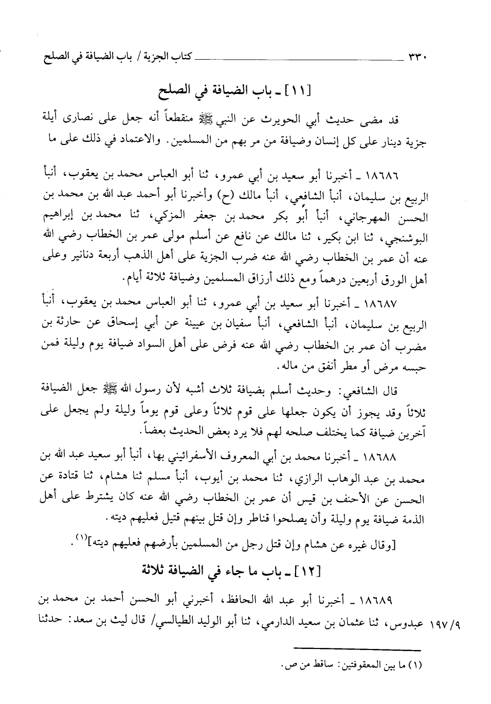 18687 - أَخْبَرَنَا أَبُو سَعِيدِ بْنُ أَبِي عَمْرٍو، ثنا أَبُو الْعَبَّاسِ مُحَمَّدُ بْنُ يَعْقُوبَ , أنبأ الرَّبِيعُ بْنُ سُلَيْمَانَ، أنبأ الشَّافِعِيُّ، أنبأ سُفْيَانُ بْنُ عُيَيْنَةَ، عَنْ أَبِي إِسْحَاقَ، عَنْ حَارِثَةَ بْنِ مُضَرِّبٍ، أَنَّ عُمَرَ بْنَ الْخَطَّابِ رَضِيَ اللهُ عَنْهُ §فَرَضَ عَلَى أَهْلِ السَّوَادِ ضِيَافَةَ يَوْمٍ وَلَيْلَةٍ , فَمَنْ حَبَسَهُ مَرَضٌ أَوْ مَطَرٌ أَنْفَقَ مِنْ مَالِهِ. قَالَ الشَّافِعِيُّ: وَحَدِيثُ أَسْلَمَ بِضِيَافَةِ ثَلَاثٍ أَشْبَهُ؛ لِأَنَّ رَسُولَ اللهِ صَلَّى اللهُ عَلَيْهِ وَسَلَّمَ جَعَلَ الضِّيَافَةَ ثَلَاثًا، وَقَدْ يَجُوزُ أَنْ يَكُونَ جَعَلَهَا عَلَى قَوْمٍ ثَلَاثًا , وَعَلَى قَوْمٍ يَوْمًا وَلَيْلَةً , وَلَمْ يَجْعَلْ عَلَى آخَرِينَ ضِيَافَةً , كَمَا يَخْتَلِفُ صُلْحُهُ لَهُمْ , فَلَا يَرُدُّ بَعْضُ الْحَدِيثِ بَعْضًا