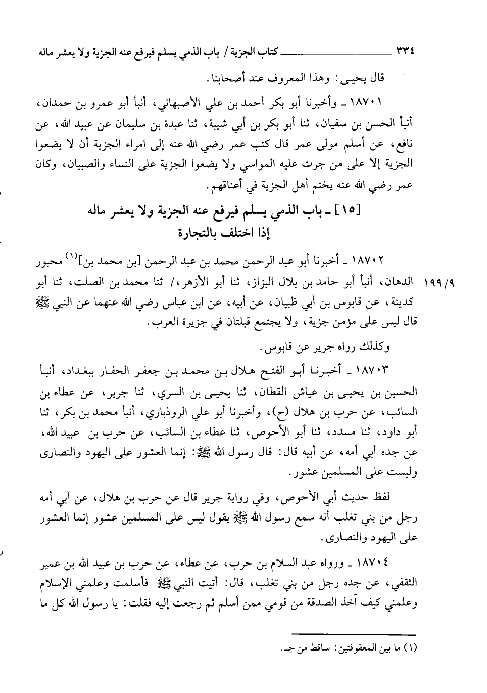 18703 - أَخْبَرَنَا أَبُو الْفَتْحِ هِلَالُ بْنُ مُحَمَّدِ بْنِ جَعْفَرٍ الْحَفَّارُ بِبَغْدَادَ , أنبأ الْحُسَيْنُ بْنُ يَحْيَى بْنِ عَيَّاشٍ الْقَطَّانُ، ثنا يَحْيَى بْنُ السَّرِيِّ، ثنا جَرِيرٌ، عَنْ عَطَاءِ بْنِ السَّائِبِ، عَنْ حَرْبِ بْنِ هِلَالٍ، ح وَأَخْبَرَنَا أَبُو عَلِيٍّ الرُّوذْبَارِيُّ، أنبأ مُحَمَّدُ بْنُ بَكْرٍ، ثنا أَبُو دَاوُدَ، ثنا مُسَدَّدٌ، ثنا أَبُو الْأَحْوَصِ، ثنا عَطَاءُ بْنُ السَّائِبِ، عَنْ حَرْبِ بْنِ عُبَيْدِ اللهِ، عَنْ جَدِّهِ أَبِي أُمِّهِ، عَنْ أَبِيهِ، قَالَ: قَالَ رَسُولُ اللهِ صَلَّى اللهُ عَلَيْهِ وَسَلَّمَ: " إِنَّمَا §الْعُشُورُ عَلَى الْيَهُودِ وَالنَّصَارَى , وَلَيْسَتْ عَلَى الْمُسْلِمِينَ عُشُورٌ ". لَفْظُ حَدِيثِ أَبِي الْأَحْوَصِ , وَفِي رِوَايَةِ جَرِيرٍ قَالَ: عَنْ حَرْبِ بْنِ هِلَالٍ , عَنْ أَبِي أُمِّهِ، رَجُلٌ مِنْ بَنِي تَغْلِبَ , أَنَّهُ سَمِعَ رَسُولَ اللهِ صَلَّى اللهُ عَلَيْهِ وَسَلَّمَ يَقُولُ: " لَيْسَ عَلَى الْمُسْلِمِينَ عُشُورٌ , إِنَّمَا الْعُشُورُ عَلَى الْيَهُودِ وَالنَّصَارَى "