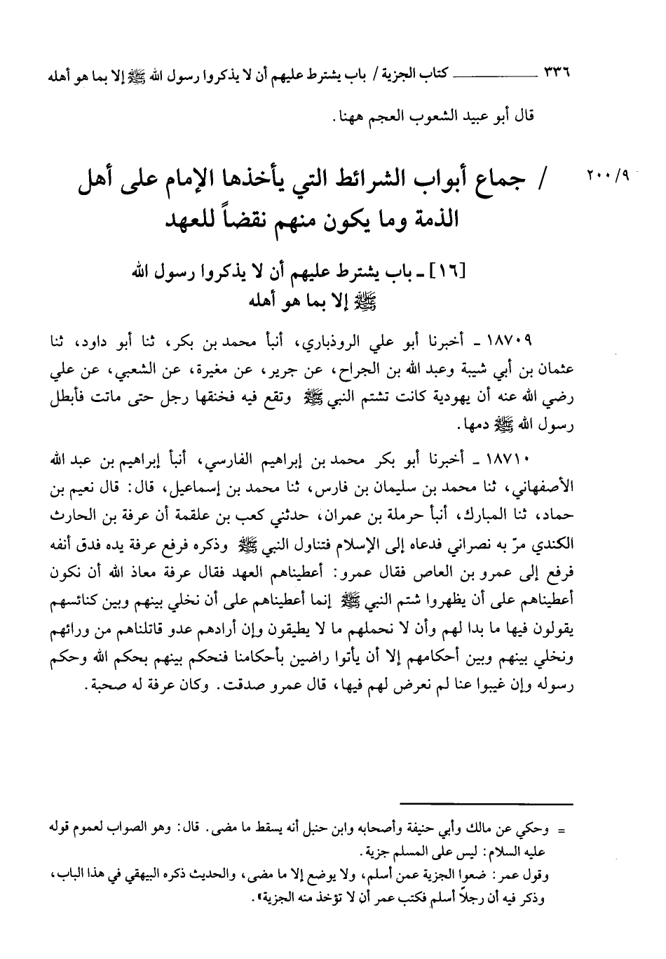 18710 - أَخْبَرَنَا أَبُو بَكْرٍ مُحَمَّدُ بْنُ إِبْرَاهِيمَ الْفَارِسِيُّ , أنبأ إِبْرَاهِيمُ بْنُ عَبْدِ اللهِ الْأَصْفَهَانِيُّ، ثنا مُحَمَّدُ بْنُ سُلَيْمَانَ بْنِ فَارِسٍ، ثنا مُحَمَّدُ بْنُ إِسْمَاعِيلَ، قَالَ: قَالَ نُعَيْمُ بْنُ حَمَّادٍ: ثنا الْمُبَارَكُ، أنبأ حَرْمَلَةُ بْنُ عِمْرَانَ، حَدَّثَنِي كَعْبُ بْنُ عَلْقَمَةَ، أَنَّ عَرَفَةَ بْنَ الْحَارِثِ الْكِنْدِيَّ مَرَّ بِهِ نَصْرَانِيٌّ فَدَعَاهُ إِلَى الْإِسْلَامِ , فَتَنَاوَلَ النَّبِيَّ صَلَّى اللهُ عَلَيْهِ وَسَلَّمَ وَذَكَرَهُ , فَرَفَعَ عَرَفَةُ يَدَهُ فَدَقَّ أَنْفَهُ , فَرُفِعَ إِلَى عَمْرِو بْنِ الْعَاصِ , فَقَالَ عَمْرٌو: أَعْطَيْنَاهُمُ الْعَهْدَ. فَقَالَ عَرَفَةُ: مَعَاذَ اللهِ أَنْ نَكُونَ أَعْطَيْنَاهُمْ عَلَى أَنْ يُظْهِرُوا شَتْمَ النَّبِيِّ صَلَّى اللهُ عَلَيْهِ وَسَلَّمَ , إِنَّمَا §أَعْطَيْنَاهُمْ عَلَى أَنْ نُخَلِّيَ بَيْنَهُمْ وَبَيْنَ كَنَائِسِهِمْ , يَقُولُونَ فِيهَا مَا بَدَا لَهُمْ , وَأَنْ لَا نُحَمِّلَهُمْ مَا لَا يَطِيقُونَ , وَإِنْ أَرَادَهُمْ عَدُوٌّ قَاتَلْنَاهُمْ مِنْ وَرَائِهِمْ , وَنُخَلِّيَ بَيْنَهُمْ وَبَيْنَ أَحْكَامِهِمْ , إِلَّا أَنْ يَأْتُوا رَاضِينَ بِأَحْكَامِنَا , فَنَحْكُمَ بَيْنَهُمْ بِحُكْمِ اللهِ وَحُكْمِ رَسُولِهِ , وَإِنْ غَيَّبُوا عَنَّا لَمْ نَعْرِضْ لَهُمْ فِيهَا. قَالَ عَمْرٌو: صَدَقْتَ وَكَانَ عَرَفَةُ لَهُ صُحْبَةٌ