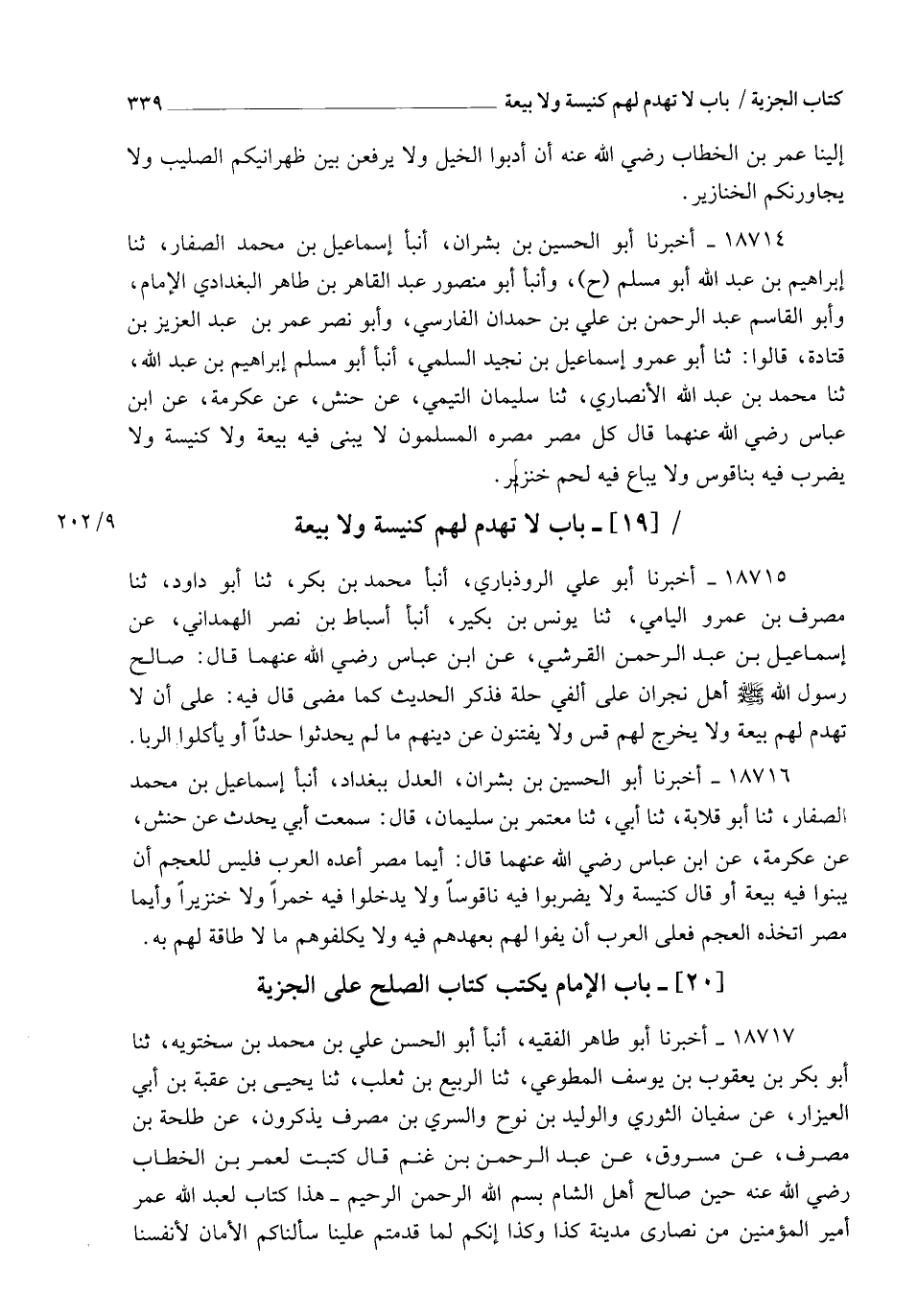 18717 - أَخْبَرَنَا أَبُو طَاهِرٍ الْفَقِيهُ، أنبأ أَبُو الْحَسَنِ عَلِيُّ بْنُ مُحَمَّدِ بْنِ سَخْتَوَيْهِ , ثنا أَبُو بَكْرِ بْنُ يَعْقُوبَ بْنِ يُوسُفَ الْمُطَّوِّعِيُّ، ثنا الرَّبِيعُ بْنُ ثَعْلَبٍ، ثنا يَحْيَى بْنُ عُقْبَةَ بْنِ أَبِي الْعَيْزَارِ، عَنْ سُفْيَانَ الثَّوْرِيِّ، وَالْوَلِيدِ بْنِ نُوحٍ، وَالسَّرِيِّ بْنِ مُصَرِّفٍ، يَذْكُرُونَ عَنْ طَلْحَةَ بْنِ مُصَرِّفٍ، عَنْ مَسْرُوقٍ، عَنْ عَبْدِ الرَّحْمَنِ بْنِ غَنْمٍ، قَالَ: كَتَبْتُ لِعُمَرَ بْنِ الْخَطَّابِ رَضِيَ اللهُ عَنْهُ حِينَ صَالَحَ أَهْلَ الشَّامِ: بِسْمِ اللهِ الرَّحْمَنِ الرَّحِيمِ , هَذَا كِتَابٌ لِعَبْدِ اللهِ عُمَرَ أَمِيرِ الْمُؤْمِنِينَ §مِنْ نَصَارَى مَدِينَةِ كَذَا وَكَذَا , إِنَّكُمْ لَمَّا قَدِمْتُمْ عَلَيْنَا سَأَلْنَاكُمُ الْأَمَانَ لِأَنْفُسِنَا -[340]- وَذَرَارِيِّنَا وَأَمْوَالِنَا وَأَهْلِ مِلَّتِنَا , وَشَرَطْنَا لَكُمْ عَلَى أَنْفُسِنَا أَنْ لَا نُحْدِثَ فِي مَدِينَتِنَا وَلَا فِيمَا حَوْلَهَا دَيْرًا وَلَا كَنِيسَةً وَلَا قَلَّايَةً وَلَا صَوْمَعَةَ رَاهِبٍ , وَلَا نُجَدِّدَ مَا خَرِبَ مِنْهَا , وَلَا نُحْيِيَ مَا كَانَ مِنْهَا فِي خُطَطِ الْمُسْلِمِينَ , وَأَنْ لَا نَمْنَعَ كَنَائِسَنَا أَنْ يَنْزِلَهَا أَحَدٌ مِنَ الْمُسْلِمِينَ فِي لَيْلٍ وَلَا نَهَارٍ , وَأَنْ نُوَسِّعَ أَبْوَابَهَا لِلْمَارَّةِ وَابْنِ السَّبِيلِ , وَأَنْ نُنْزِلَ مَنْ مَرَّ بِنَا مِنَ الْمُسْلِمِينَ ثَلَاثَةَ أَيَّامٍ وَنُطْعِمَهُمْ , وَأَنْ لَا نُؤَمِّنَ فِي كَنَائِسِنَا وَلَا مَنَازِلِنَا جَاسُوسًا , وَلَا نَكْتُمَ غِشًّا لِلْمُسْلِمِينَ , وَلَا نُعَلِّمَ أَوْلَادَنَا الْقُرْآنَ , وَلَا نُظْهِرَ شِرْكًا وَلَا نَدْعُوَ إِلَيْهِ أَحَدًا , وَلَا نَمْنَعَ أَحَدًا مِنْ قَرَابَتِنَا الدُّخُولَ فِي الْإِسْلَامِ إِنْ أَرَادَهُ , وَأَنْ نُوَقِّرَ الْمُسْلِمِينَ , وَأَنْ نَقُومَ لَهُمْ مِنْ مَجَالِسِنَا إِنْ أَرَادُوا جُلُوسًا , وَلَا نَتَشَبَّهَ بِهِمْ فِي شَيْءٍ مِنْ لِبَاسِهِمْ مِنْ قَلَنْسُوَةٍ وَلَا عِمَامَةٍ وَلَا نَعْلَيْنِ وَلَا فَرْقِ شَعَرٍ , وَلَا نَتَكَلَّمَ بِكَلَامِهِمْ , وَلَا نَتَكَنَّى بِكُنَاهُمْ , وَلَا نَرْكَبَ السُّرُوجَ , وَلَا نَتَقَلَّدَ السُّيُوفَ , وَلَا نَتَّخِذَ شَيْئًا مِنَ السِّلَاحِ , وَلَا نَحْمِلَهُ مَعَنَا , وَلَا نَنْقُشَ خَوَاتِيمَنَا بِالْعَرَبِيَّةِ , وَلَا نَبِيعَ الْخُمُورَ , وَأَنْ نَجُزَّ مَقَادِيمَ رُءُوسِنَا , وَأَنْ نَلْزَمَ زِيَّنَا حَيْثُ مَا كُنَّا , وَأَنْ نَشُدَّ الزَّنَانِيرَ عَلَى أَوْسَاطِنَا , وَأَنْ لَا نُظْهِرَ صُلُبَنَا وَكُتُبَنَا فِي شَيْءٍ مِنْ طَرِيقِ الْمُسْلِمِينَ وَلَا أَسْوَاقِهِمْ , وَأَنْ لَا نُظْهِرَ الصَّلِيبَ عَلَى كَنَائِسِنَا , وَأَنْ لَا نَضْرِبَ بِنَاقُوسٍ فِي كَنَائِسِنَا بَيْنَ حَضْرَةِ الْمُسْلِمِينَ , وَأَنْ لَا نُخْرِجَ سَعَانِينًا وَلَا بَاعُونًا , وَلَا نَرْفَعَ أَصْوَاتَنَا مَعَ أَمْوَاتِنَا , وَلَا نُظْهِرَ النِّيرَانَ مَعَهُمْ فِي شَيْءٍ مِنْ طَرِيقِ الْمُسْلِمِينَ , وَلَا نُجَاوِزَهُمْ مَوْتَانَا , وَلَا نَتَّخِذَ مِنَ الرَّقِيقِ مَا جَرَى عَلَيْهِ سِهَامُ الْمُسْلِمِينَ , وَأَنْ نُرْشِدَ الْمُسْلِمِينَ , وَلَا نَطَّلِعَ عَلَيْهِمْ فِي مَنَازِلِهِمْ. فَلَمَّا أَتَيْتُ عُمَرَ رَضِيَ اللهُ عَنْهُ بِالْكِتَابِ زَادَ فِيهِ: وَأَنْ لَا نَضْرِبَ أَحَدًا مِنَ الْمُسْلِمِينَ , شَرَطْنَا لَهُمْ ذَلِكَ عَلَى أَنْفُسِنَا وَأَهْلِ مِلَّتِنَا وَقَبِلْنَا مِنْهُمُ الْأَمَانَ , فَإِنْ نَحْنُ خَالَفْنَا شَيْئًا مِمَّا شَرَطْنَاهُ لَكُمْ فَضَمِنَّاهُ عَلَى أَنْفُسِنَا فَلَا ذِمَّةَ لَنَا , وَقَدْ حَلَّ لَكُمْ مَا يَحِلُّ لَكُمْ مِنْ أَهْلِ الْمُعَانَدَةِ 