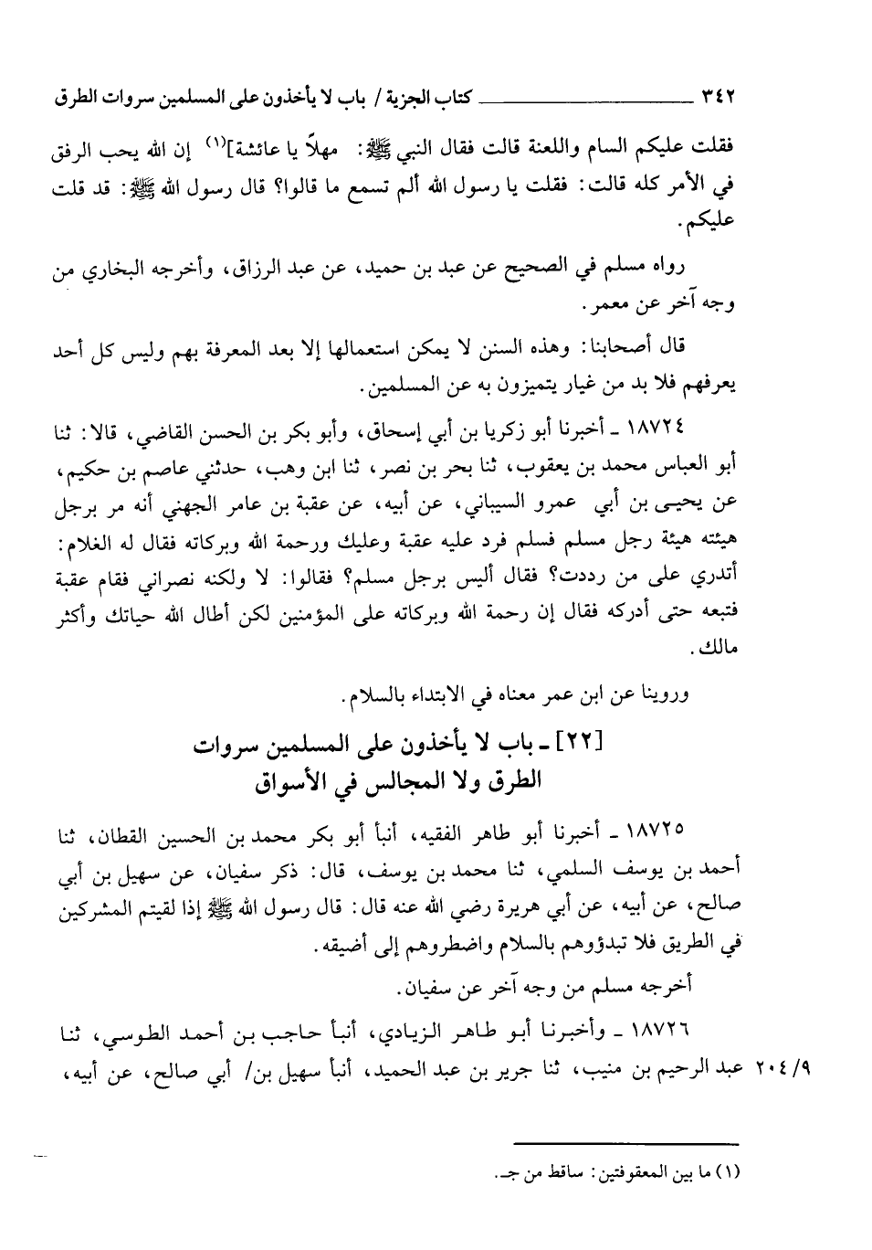 18726 - وَأَخْبَرَنَا أَبُو طَاهِرٍ الزِّيَادِيُّ، أنبأ حَاجِبُ بْنُ أَحْمَدَ الطُّوسِيُّ، ثنا عَبْدُ الرَّحِيمِ بْنُ مُنِيبٍ، ثنا جَرِيرُ بْنُ عَبْدِ الْحَمِيدِ، أنبأ سُهَيْلُ بْنُ أَبِي صَالِحٍ، عَنْ أَبِيهِ، -[343]- عَنْ أَبِي هُرَيْرَةَ رَضِيَ اللهُ عَنْهُ قَالَ: قَالَ رَسُولُ اللهِ صَلَّى اللهُ عَلَيْهِ وَسَلَّمَ: §" إِذَا لَقِيتُمُوهُمْ فَلَا تَبْدَءُوهُمْ بِالسَّلَامِ , وَاضْطَرُّوهُمْ إِلَى أَضْيَقِ الطَّرِيقِ ". قَالَ هَذَا لِلنَّصَارَى فِي النَّعْتِ , وَنَحْنُ نَرَاهُ لِلْمُشْرِكِينَ. رَوَاهُ مُسْلِمٌ فِي الصَّحِيحِ عَنْ زُهَيْرِ بْنِ حَرْبٍ , عَنْ جَرِيرٍ