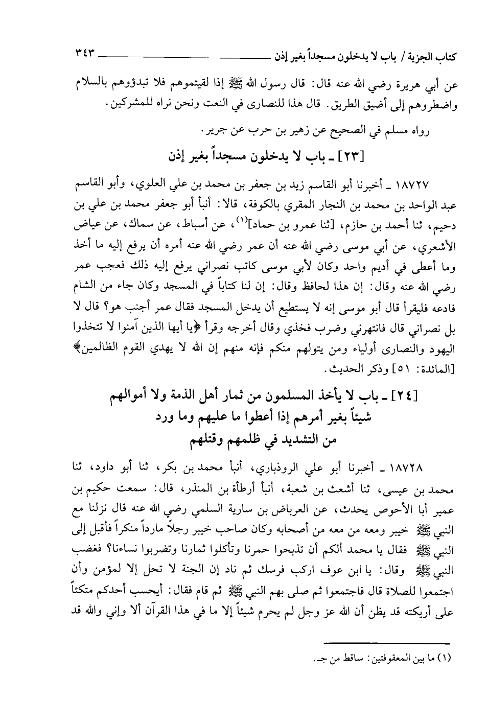 18727 - أَخْبَرَنَا أَبُو الْقَاسِمِ زَيْدُ بْنُ جَعْفَرِ بْنِ مُحَمَّدِ بْنِ عَلِيٍّ الْعَلَوِيُّ , وَأَبُو الْقَاسِمِ عَبْدُ الْوَاحِدِ بْنُ مُحَمَّدِ بْنِ النَّجَّارِ الْمُقْرِئُ بِالْكُوفَةِ قَالَا: أنبأ أَبُو جَعْفَرٍ مُحَمَّدُ بْنُ عَلِيِّ بْنِ دُحَيْمٍ , ثنا أَحْمَدُ بْنُ حَازِمٍ، ثنا عَمْرُو بْنُ حَمَّادٍ، عَنْ أَسْبَاطٍ، عَنْ سِمَاكٍ، عَنْ عِيَاضٍ الْأَشْعَرِيِّ، عَنْ أَبِي مُوسَى رَضِيَ اللهُ عَنْهُ أَنَّ عُمَرَ رَضِيَ اللهُ عَنْهُ أَمَرَهُ أَنْ §يَرْفَعَ إِلَيْهِ مَا أَخَذَ وَمَا أَعْطَى فِي أَدِيمٍ وَاحِدٍ , وَكَانَ لِأَبِي مُوسَى كَاتِبٌ نَصْرَانِيٌّ يَرْفَعُ إِلَيْهِ ذَلِكَ , فَعَجِبَ عُمَرُ رَضِيَ اللهُ عَنْهُ وقَالَ: إِنَّ هَذَا لَحَافِظٌ , وَقَالَ: إِنَّ لَنَا كِتَابًا فِي الْمَسْجِدِ , وَكَانَ جَاءَ مِنَ الشَّامِ , فَادْعُهُ فَلْيَقْرَأْ. قَالَ أَبُو مُوسَى: إِنَّهُ لَا يَسْتَطِيعُ أَنْ يَدْخُلَ الْمَسْجِدَ. فَقَالَ عُمَرُ أَجُنُبٌ هُوَ؟ قَالَ: لَا , بَلْ نَصْرَانِيٌّ. قَالَ: فَانْتَهَرَنِي وَضَرَبَ فَخِذِي وَقَالَ: أَخْرِجْهُ، وَقَرَأَ: {يَا أَيُّهَا الَّذِينَ آمَنُوا لَا تَتَّخِذُوا الْيَهُودَ وَالنَّصَارَى أَوْلِيَاءَ بَعْضُهُمْ أَوْلِيَاءُ بَعْضٍ وَمَنْ يَتَوَلَّهُمْ مِنْكُمْ فَإِنَّهُ مِنْهُمْ إِنَّ اللهَ لَا يَهْدِي الْقَوْمَ الظَّالِمِينَ} [المائدة: 51]، وَذَكَرَ الْحَدِيثَ