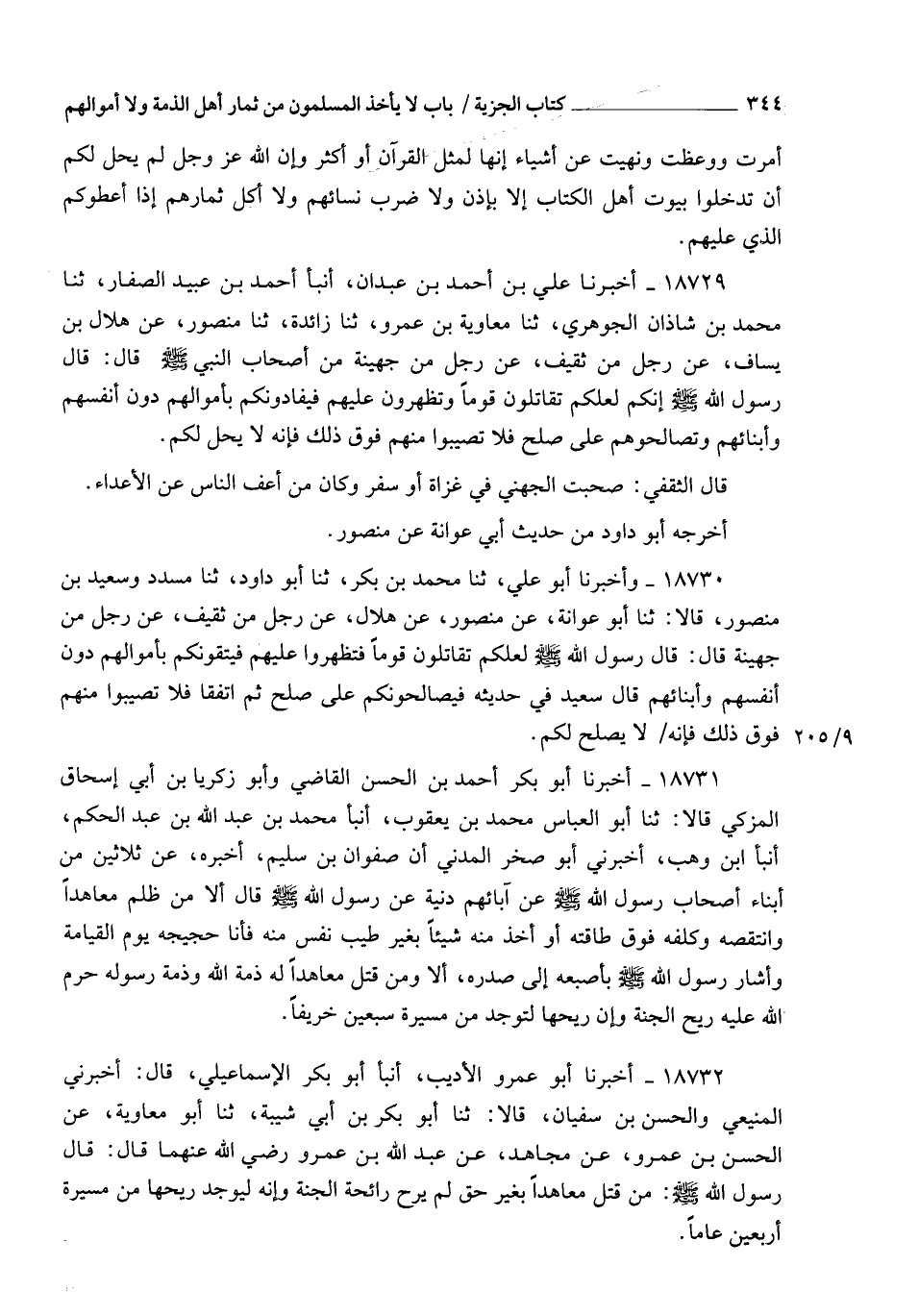 18729 - أَخْبَرَنَا عَلِيُّ بْنُ أَحْمَدَ بْنِ عَبْدَانَ، أنبأ أَحْمَدُ بْنُ عَبِيدٍ الصَّفَارُ , ثنا مُحَمَّدُ بْنُ شَاذَانَ الْجَوْهَرِيُّ، ثنا مُعَاوِيَةُ بْنُ عَمْرٍو، ثنا زَائِدَةُ، ثنا مَنْصُورٌ، عَنْ هِلَالِ بْنِ يَسَافٍ، عَنْ رَجُلٍ مِنْ ثَقِيفٍ , عَنْ رَجُلٍ مِنْ جُهَيْنَةَ مِنْ أَصْحَابِ النَّبِيِّ صَلَّى اللهُ عَلَيْهِ وَسَلَّمَ قَالَ: قَالَ رَسُولُ اللهِ صَلَّى اللهُ عَلَيْهِ وَسَلَّمَ: " إِنَّكُمْ §لَعَلَّكُمْ تُقَاتِلُونَ قَوْمًا وَتَظْهَرُونَ عَلَيْهِمْ فَيُفَادُوكُمْ بِأَمْوَالِهِمْ دُونَ أَنْفُسِهِمْ وَأَبْنَائِهِمْ , وَتُصَالِحُوهُمْ عَلَى صُلْحٍ فَلَا تُصِيبُوا مِنْهُمْ فَوْقَ ذَلِكَ , فَإِنَّهُ لَا يَحِلُّ لَكُمْ ". قَالَ الثَّقَفِيُّ: صَحِبْتُ الْجُهَنِيَّ فِي غَزَاةٍ أَوْ سَفَرٍ , وَكَانَ مِنْ أَعَفِّ النَّاسِ عَنِ الْأَعْدَاءِ. أَخْرَجَهُ أَبُو دَاوُدَ مِنْ حَدِيثِ أَبِي عَوَانَةَ عَنْ مَنْصُورٍ