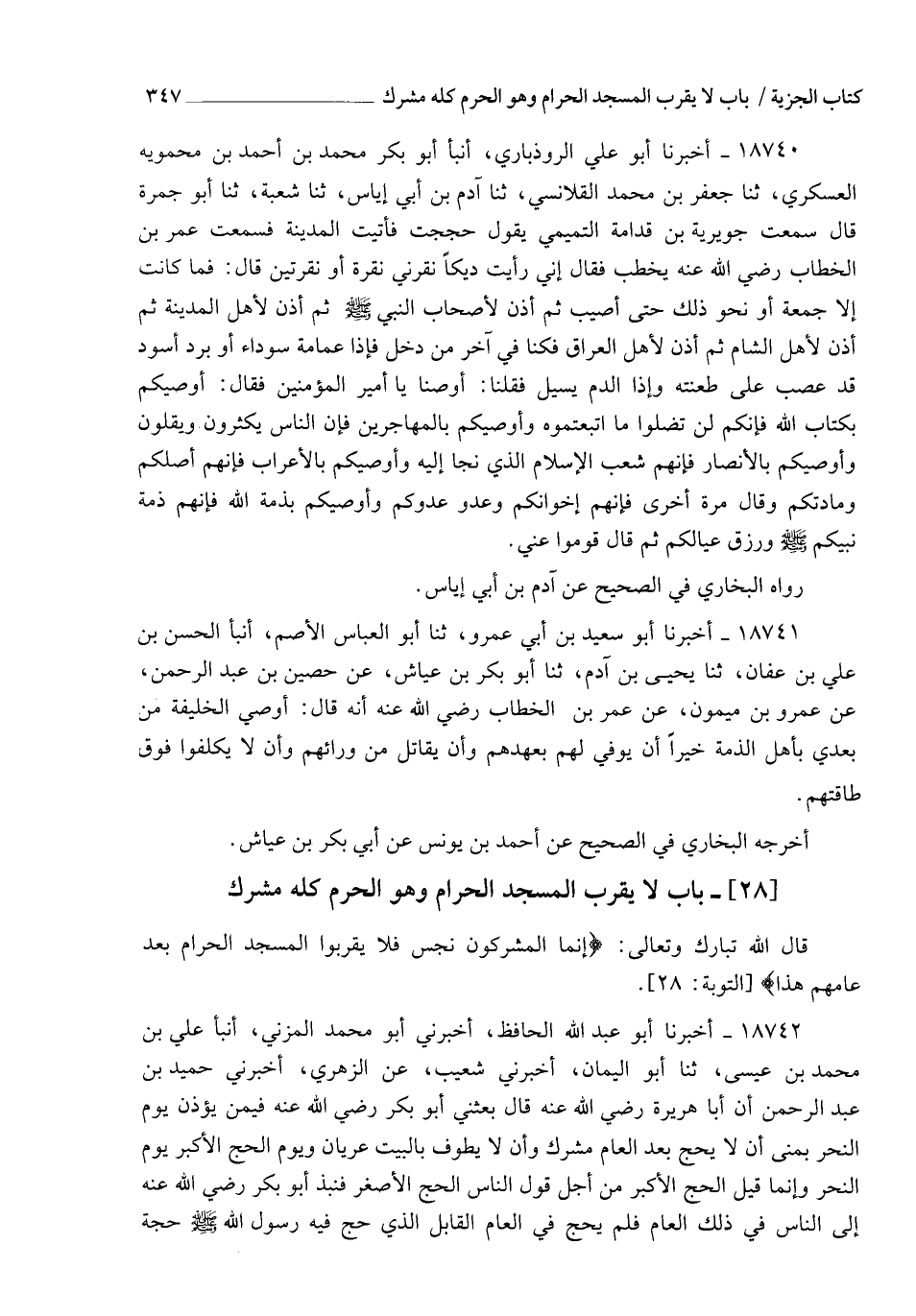 18741 - أَخْبَرَنَا أَبُو سَعِيدِ بْنُ أَبِي عَمْرٍو، ثنا أَبُو الْعَبَّاسِ الْأَصَمُّ، أنبأ الْحَسَنُ بْنُ عَلِيِّ بْنِ عَفَّانَ، ثنا يَحْيَى بْنُ آدَمَ، ثنا أَبُو بَكْرِ بْنُ عَيَّاشٍ، عَنْ حُصَيْنِ بْنِ عَبْدِ الرَّحْمَنِ، عَنْ عَمْرِو بْنِ مَيْمُونٍ، عَنْ عُمَرَ بْنِ الْخَطَّابِ رَضِيَ اللهُ عَنْهُ أَنَّهُ قَالَ: §أُوصِي الْخَلِيفَةَ مِنْ بَعْدِي بِأَهْلِ الذِّمَّةِ خَيْرًا , أَنْ يُوفِيَ لَهُمْ بِعَهْدِهِمْ , وَأَنْ يُقَاتِلَ مِنْ وَرَائِهِمْ , وَأَنْ لَا يُكَلَّفُوا فَوْقَ طَاقَتِهِمْ. أَخْرَجَهُ الْبُخَارِيُّ فِي الصَّحِيحِ عَنْ أَحْمَدَ بْنِ يُونُسَ , عَنْ أَبِي بَكْرِ بْنِ عَيَّاشٍ