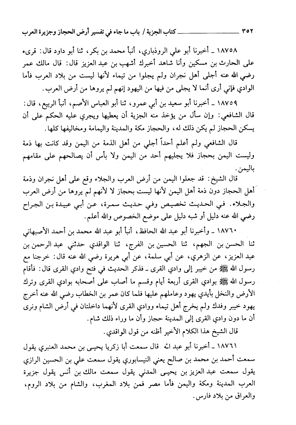 18758 - أَخْبَرَنَا أَبُو عَلِيٍّ الرُّوذْبَارِيُّ، أنبأ مُحَمَّدُ بْنُ بَكْرٍ، ثنا أَبُو دَاوُدَ، قَالَ: قُرِئَ عَلَى الْحَارِثِ بْنِ مِسْكِينٍ وَأَنَا شَاهِدٌ، أَخْبَرَكَ أَشْهَبُ بْنُ عَبْدِ الْعَزِيزِ، قَالَ: قَالَ مَالِكٌ: عُمَرُ رَضِيَ اللهُ عَنْهُ §أَجْلَى أَهْلَ نَجْرَانَ وَلَمْ يُجْلَوْا مِنْ تَيْمَاءَ لِأَنَّهَا لَيْسَتْ مِنْ بِلَادِ الْعَرَبِ , فَأَمَّا الْوَادِي فَإِنِّي أَرَى أَنَّمَا لَا يُجْلَى مَنْ فِيهَا مِنَ الْيَهُودِ أَنَّهُمْ لَمْ يَرَوْهَا مِنْ أَرْضِ الْعَرَبِ