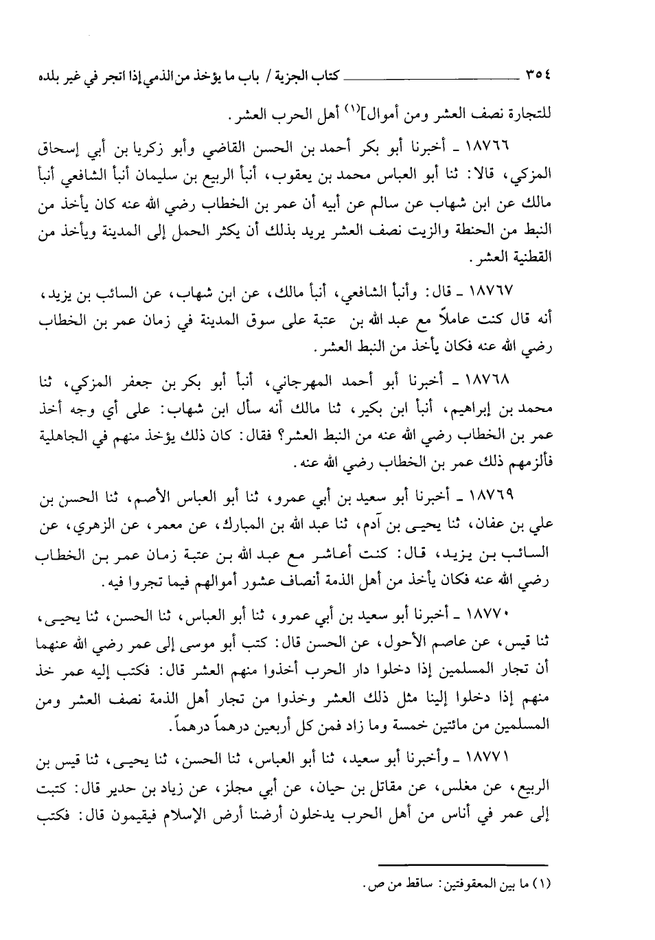 18768 - أَخْبَرَنَا أَبُو أَحْمَدَ الْمِهْرَجَانِيُّ، أنبأ أَبُو بَكْرِ بْنُ جَعْفَرٍ الْمُزَكِّي، ثنا مُحَمَّدُ بْنُ إِبْرَاهِيمَ، أنبأ ابْنُ بُكَيْرٍ، ثنا مَالِكٌ، أَنَّهُ سَأَلَ ابْنَ شِهَابٍ: عَلَى أِيِّ وَجْهٍ §أَخَذَ عُمَرُ بْنُ الْخَطَّابِ رَضِيَ اللهُ عَنْهُ مِنَ النَّبَطِ الْعُشْرَ؟ فَقَالَ: كَانَ ذَلِكَ يُؤْخَذُ مِنْهُمْ فِي الْجَاهِلِيَّةِ فَأَلْزَمَهُمْ ذَلِكَ عُمَرُ بْنُ الْخَطَّابِ رَضِيَ اللهُ عَنْهُ