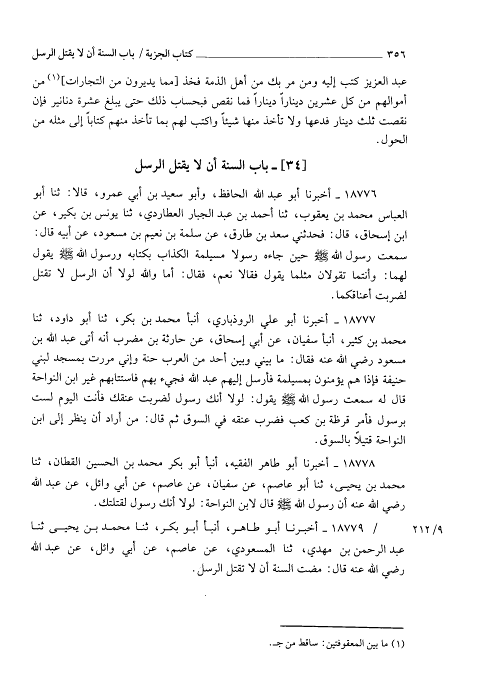 18777 - أَخْبَرَنَا أَبُو عَلِيٍّ الرُّوذْبَارِيُّ، أنبأ مُحَمَّدُ بْنُ بَكْرٍ، ثنا أَبُو دَاوُدَ، ثنا مُحَمَّدُ بْنُ كَثِيرٍ، أنبأ سُفْيَانُ، عَنْ أَبِي إِسْحَاقَ، عَنْ حَارِثَةَ بْنِ مُضَرِّبٍ، أَنَّهُ أَتَى عَبْدَ اللهِ بْنَ مَسْعُودٍ رَضِيَ اللهُ عَنْهُ فَقَالَ: مَا بَيْنِي وَبَيْنَ أَحَدٍ مِنَ الْعَرَبِ حِنَّةٌ وَإِنِّي مَرَرْتُ بِمَسْجِدٍ لِبَنِي حَنِيفَةَ فَإِذَا هُمْ يُؤْمِنُونَ بِمُسَيْلِمَةَ , فَأَرْسَلَ إِلَيْهِمْ عَبْدُ اللهِ فَجِيءَ بِهِمْ فَاسْتَتَابَهُمْ غَيْرَ ابْنِ النَّوَّاحَةِ قَالَ لَهُ: سَمِعْتُ رَسُولَ اللهِ صَلَّى اللهُ عَلَيْهِ وَسَلَّمَ يَقُولُ: " §لَوْلَا أَنَّكَ رَسُولٌ لَضَرَبْتُ عُنُقَكَ " , فَأَنْتَ الْيَوْمَ لَسْتَ بِرَسُولٍ , فَأَمَرَ قَرَظَةَ بْنَ كَعْبٍ فَضَرَبَ عُنُقَهُ فِي السُّوقِ ثُمَّ قَالَ: مَنْ أَرَادَ أَنْ يَنْظُرَ إِلَى ابْنِ النَّوَّاحَةِ قَتِيلًا بِالسُّوقِ