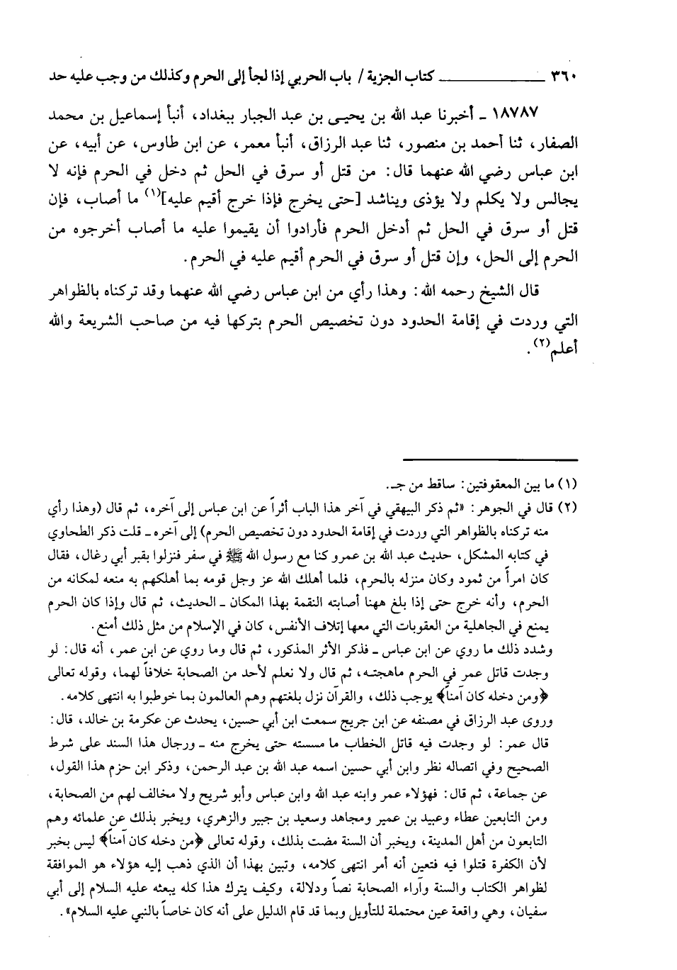18787 - أَخْبَرَنَا عَبْدُ اللهِ بْنُ يَحْيَى بْنِ عَبْدِ الْجَبَّارِ بِبَغْدَادَ , أنبأ إِسْمَاعِيلُ بْنُ مُحَمَّدٍ الصَّفَّارُ، ثنا أَحْمَدُ بْنُ مَنْصُورٍ، ثنا عَبْدُ الرَّزَّاقِ، أنبأ مَعْمَرٌ، عَنِ ابْنِ طَاوُسٍ، عَنْ أَبِيهِ، عَنِ ابْنِ عَبَّاسٍ رَضِيَ اللهُ عَنْهُمَا قَالَ: §مَنْ قَتَلَ أَوْ سَرَقَ فِي الْحِلِّ ثُمَّ دَخَلَ فِي الْحَرَمِ فَإِنَّهُ لَا يُجَالَسُ وَلَا يُكَلَّمُ وَلَا يُؤْذَى , وَيُنَاشَدُ حَتَّى يَخْرُجَ , فَإِذَا خَرَجَ أُقِيمَ عَلَيْهِ مَا أَصَابَ , فَإِنْ قَتَلَ أَوْ سَرَقَ فِي الْحِلِّ ثُمَّ أُدْخِلَ الْحَرَمَ فَأَرَادُوا أَنْ يُقِيمُوا عَلَيْهِ مَا أَصَابَ أَخْرَجُوهُ مِنَ الْحَرَمِ إِلَى الْحِلِّ , وَإِنْ قَتَلَ أَوْ سَرَقَ فِي الْحَرَمِ أُقِيمَ عَلَيْهِ فِي الْحَرَمِ. قَالَ الشَّيْخُ رَحِمَهُ اللهُ: وَهَذَا مِِنْ رَأْيِ ابْنِ عَبَّاسٍ رَضِيَ اللهُ عَنْهُمَا , وَقَدْ تَرَكْنَاهُ بِالظَّوَاهِرِ الَّتِي وَرَدَتْ فِي إِقَامَةِ الْحُدُودِ دُونَ تَخْصِيصِ الْحَرَمِ بِتَرْكِهَا فِيهِ مِنْ صَاحِبِ الشَّرِيعَةِ وَاللهُ أَعْلَمُ