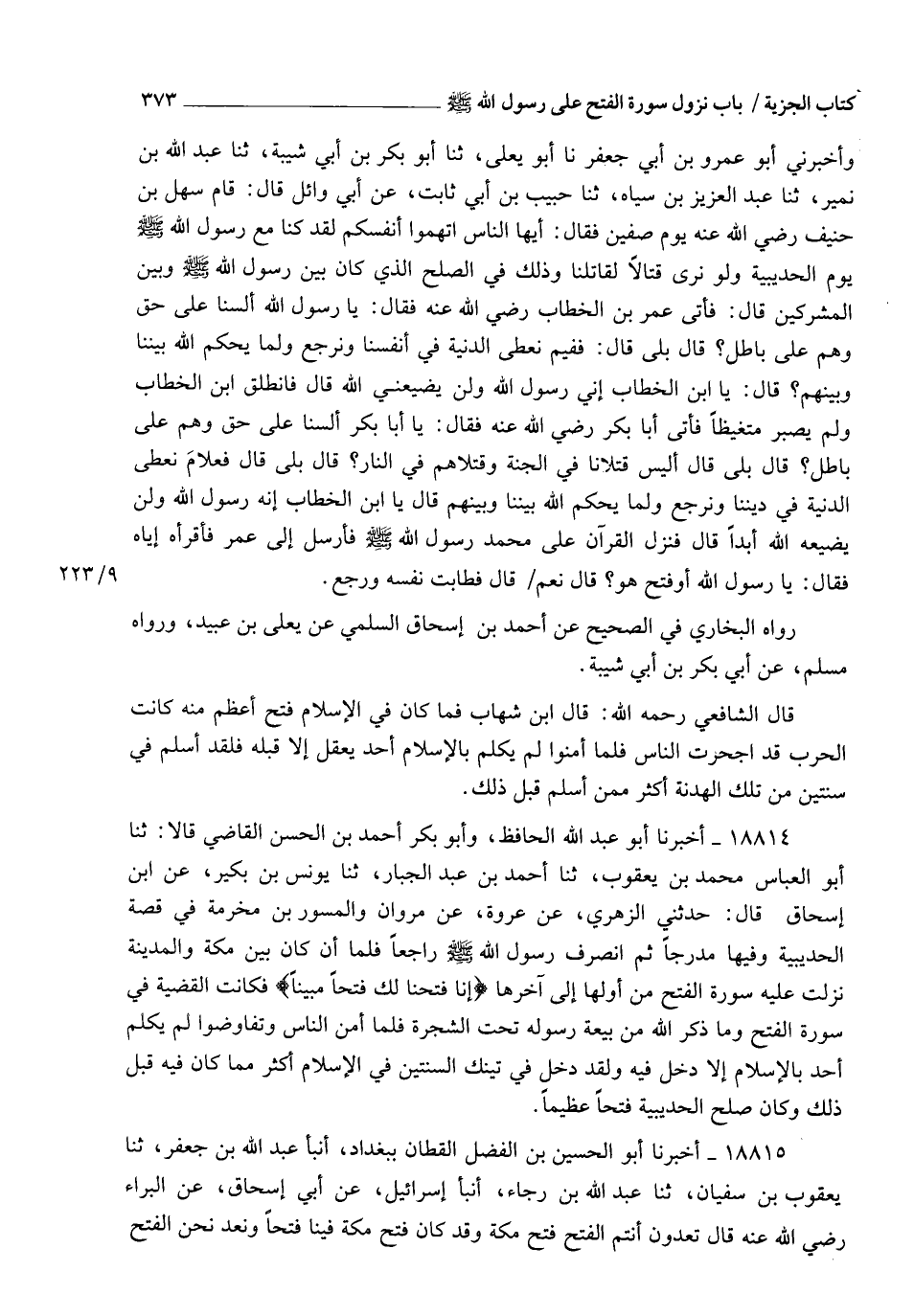 18814 - أَخْبَرَنَا أَبُو عَبْدِ اللهِ الْحَافِظُ، وَأَبُو بَكْرٍ أَحْمَدُ بْنُ الْحَسَنِ الْقَاضِي قَالَا: ثنا أَبُو الْعَبَّاسِ مُحَمَّدُ بْنُ يَعْقُوبَ , ثنا أَحْمَدُ بْنُ عَبْدِ الْجَبَّارِ، ثنا يُونُسُ بْنُ بُكَيْرٍ، عَنِ ابْنِ إِسْحَاقَ، قَالَ: حَدَّثَنِي الزُّهْرِيُّ، عَنْ عُرْوَةَ، عَنْ مَرْوَانَ، وَالْمِسْوَرِ بْنِ مَخْرَمَةَ، فِي قِصَّةِ الْحُدَيْبِيَةِ وَفِيهَا مُدْرَجًا: ثُمَّ انْصَرَفَ رَسُولُ اللهِ صَلَّى اللهُ عَلَيْهِ وَسَلَّمَ رَاجِعًا , فَلَمَّا أَنْ كَانَ بَيْنَ مَكَّةَ وَالْمَدِينَةِ نَزَلَتْ عَلَيْهِ سُورَةُ الْفَتْحِ مِنْ أَوَّلِهَا إِلَى آخِرِهَا {§إِنَّا فَتَحْنَا لَكَ فَتْحًا مُبِينًا} [الفتح: 1] فَكَانَتِ الْقَضِيَّةُ فِي سُورَةِ الْفَتْحِ وَمَا ذَكَرَ اللهُ مِنْ بَيْعَةِ رَسُولِهِ تَحْتَ الشَّجَرَةِ , فَلَمَّا أَمِنَ النَّاسُ وَتَفَاوَضُوا لَمْ يُكَلَّمْ أَحَدٌ بِالْإِسْلَامِ إِلَّا دَخَلَ فِيهِ , وَلَقَدْ دَخَلَ فِي تَيْنِكَ السَّنَتَيْنِ فِي الْإِسْلَامِ أَكْثَرُ مِمَّا كَانَ فِيهِ قَبْلَ ذَلِكَ , وَكَانَ صُلْحُ الْحُدَيْبِيَةِ فَتْحًا عَظِيمًا