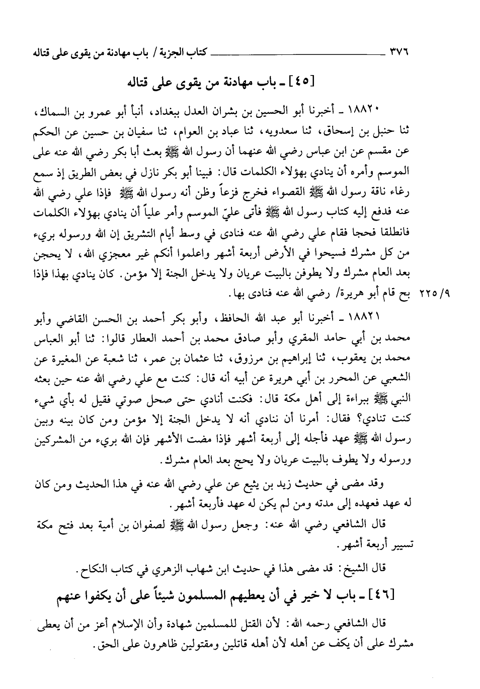 18820 - أَخْبَرَنَا أَبُو الْحُسَيْنِ بْنُ بِشْرَانَ الْعَدْلُ بِبَغْدَادَ , أنبأ أَبُو عَمْرِو بْنُ السَّمَّاكِ، ثنا حَنْبَلُ بْنُ إِسْحَاقَ، ثنا سَعْدَوَيْهِ، ثنا عَبَّادُ بْنُ الْعَوَّامِ، ثنا سُفْيَانُ بْنُ حُسَيْنٍ، عَنِ الْحَكَمِ، عَنْ مِقْسَمٍ، عَنِ ابْنِ عَبَّاسٍ رَضِيَ اللهُ عَنْهُمَا , أَنَّ رَسُولَ اللهِ صَلَّى اللهُ عَلَيْهِ وَسَلَّمَ بَعَثَ أَبَا بَكْرٍ رَضِيَ اللهُ عَنْهُ عَلَى الْمَوْسِمِ وَأَمَرَهُ أَنْ يُنَادِيَ بِهَؤُلَاءِ الْكَلِمَاتِ , قَالَ: فَبَيْنَا أَبُو بَكْرٍ نَازِلٌ فِي بَعْضِ الطَّرِيقِ إِذْ سَمِعَ رُغَاءَ نَاقَةِ رَسُولِ اللهِ صَلَّى اللهُ عَلَيْهِ وَسَلَّمَ الْقَصْوَاءِ , فَخَرَجَ فَزِعًا وَظَنَّ أَنَّهُ رَسُولُ اللهِ صَلَّى اللهُ عَلَيْهِ وَسَلَّمَ , فَإِذَا عَلِيٌّ رَضِيَ اللهُ عَنْهُ , فَدَفَعَ إِلَيْهِ كِتَابَ رَسُولِ اللهِ صَلَّى اللهُ عَلَيْهِ وَسَلَّمَ , فَأَتَى عَلَى الْمَوْسِمِ وَأَمَرَ عَلِيًّا أَنْ يُنَادِيَ بِهَؤُلَاءِ الْكَلِمَاتِ , فَانْطَلَقَا فَحَجَّا , فَقَامَ عَلِيٌّ رَضِيَ اللهُ عَنْهُ فَنَادَى فِي وَسَطِ أَيَّامِ التَّشْرِيقِ: إِنَّ §اللهَ وَرَسُولَهُ بَرِيءٌ مِنْ كُلِّ مُشْرِكٍ , فَسِيحُوا فِي الْأَرْضِ أَرْبَعَةَ أَشْهُرٍ وَاعْلَمُوا أَنَّكُمْ غَيْرُ مُعْجِزِي اللهِ , لَا يَحُجَّنَّ بَعْدَ الْعَامِ مُشْرِكٌ , وَلَا يَطُوفَنَّ بِالْبَيْتِ عُرْيَانٌ , وَلَا يَدْخُلُ الْجَنَّةَ إِلَّا مُؤْمِنٌ. كَانَ يُنَادِي بِهَذَا , فَإِذَا بُحَّ قَامَ أَبُو هُرَيْرَةَ رَضِيَ اللهُ عَنْهُ فَنَادَى بِهَا