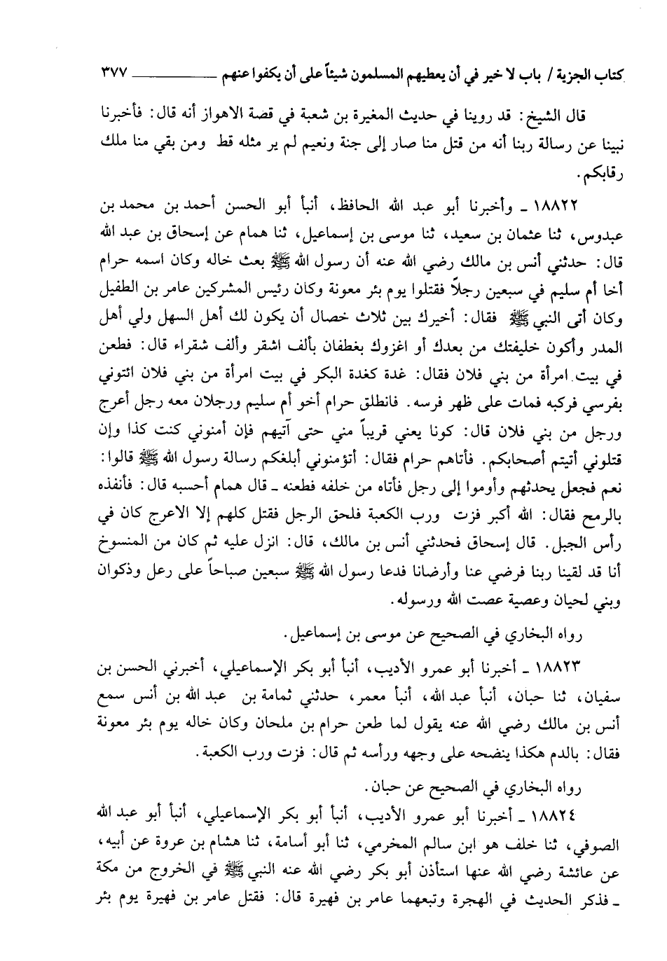 18822 - وَأَخْبَرَنَا أَبُو عَبْدِ اللهِ الْحَافِظُ، أنبأ أَبُو الْحَسَنِ أَحْمَدُ بْنُ مُحَمَّدِ بْنِ عَبْدُوسٍ , ثنا عُثْمَانُ بْنُ سَعِيدٍ، ثنا مُوسَى بْنُ إِسْمَاعِيلَ، ثنا هَمَّامٌ، عَنْ إِسْحَاقَ بْنِ عَبْدِ اللهِ، قَالَ: حَدَّثَنِي أَنَسُ بْنُ مَالِكٍ رَضِيَ اللهُ عَنْهُ أَنَّ رَسُولَ اللهِ صَلَّى اللهُ عَلَيْهِ وَسَلَّمَ بَعَثَ خَالَهُ وَكَانَ اسْمُهُ حَرَامًا أَخَا أُمِّ سَلِيمٍ فِي سَبْعِينَ رَجُلًا فَقُتِلُوا يَوْمَ بِئْرِ مَعُونَةَ , وَكَانَ رَئِيسُ الْمُشْرِكِينَ عَامِرَ بْنَ الطُّفَيْلِ , وَكَانَ أَتَى النَّبِيَّ صَلَّى اللهُ عَلَيْهِ وَسَلَّمَ فَقَالَ: أُخَيِّرُكَ بَيْنَ ثَلَاثِ خِصَالٍ: أَنْ يَكُونَ لَكَ أَهْلُ السَّهْلِ وَلِي أَهْلُ الْمَدَرِ , وَأَكُونَ خَلِيفَتَكَ مِنْ بَعْدِكَ أَوْ أَغْزُوَكَ بِغَطَفَانَ بِأَلْفِ أَشْقَرَ وَأَلْفِ شَقْرَاءَ. قَالَ: فَطُعِنَ فِي بَيْتِ امْرَأَةٍ مِنْ بَنِي فُلَانٍ فَقَالَ: غُدَّةٌ كَغُدَّةِ الْبَكْرِ فِي بَيْتِ امْرَأَةٍ مِنْ بَنِي فُلَانٍ , ائْتُونِي بِفَرَسِي , فَرَكِبَهُ فَمَاتَ عَلَى ظَهْرِ فَرَسِهِ فَانْطَلَقَ حَرَامٌ أَخُو أُمِّ سُلَيْمٍ وَرَجُلَانِ مَعَهُ رَجُلٌ أَعْرَجُ وَرَجُلٌ مِنْ بَنِي فُلَانٍ , قَالَ: كُونَا , يَعْنِي قَرِيبًا مِنِّي حَتَّى آتِيَهُمْ , فَإِنْ أَمَّنُونِي كُنْتُ كَذَا , وَإِنْ قَتَلُونِي أَتَيْتُمْ أَصْحَابَكُمْ , فَأَتَاهُمْ حَرَامٌ فَقَالَ: أَتُؤَمِّنُونَنِي أُبَلِّغْكُمْ رِسَالَةَ رَسُولِ اللهِ صَلَّى اللهُ عَلَيْهِ وَسَلَّمَ؟ قَالُوا: نَعَمْ. فَجَعَلَ يُحَدِّثُهُمْ، وَأَوْمَوْا إِلَى رَجُلٍ فَأَتَاهُ مِنْ خَلْفِهِ فَطَعَنْهُ. قَالَ هَمَّامٌ: أَحْسَبُهُ قَالَ: فَأَنْفَذَهُ بِالرُّمْحِ , فَقَالَ: اللهُ أَكْبَرُ فُزْتُ وَرَبِّ الْكَعْبَةِ , فَلَحِقَ الرَّجُلُ فَقَتَلَ كُلَّهُمْ إِلَّا الْأَعْرَجَ كَانَ فِي رَأْسِ الْجَبَلِ. قَالَ إِسْحَاقُ: فَحَدَّثَنِي أَنَسُ بْنُ مَالِكٍ قَالَ: §أُنْزِلَ عَلَيْهِ , ثُمَّ كَانَ مِنَ الْمَنْسُوخِ: " إِنَّا قَدْ لَقِينَا رَبَّنَا فَرَضِيَ عَنْا وَأَرْضَانَا " , فَدَعَا رَسُولُ اللهِ صَلَّى اللهُ عَلَيْهِ وَسَلَّمَ سَبْعِينَ صَبَاحًا عَلَى رِعْلٍ وَذَكْوَانَ وَبَنِي لِحْيَانَ وَعُصَيَّةَ عَصَتِ اللهَ وَرَسُولَهُ. رَوَاهُ الْبُخَارِيُّ فِي الصَّحِيحِ عَنْ مُوسَى بْنِ إِسْمَاعِيلَ