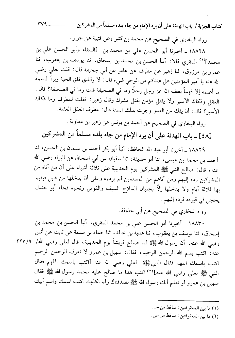 18829 - أَخْبَرَنَا أَبُو عَبْدِ اللهِ الْحَافِظُ، أنبأ أَبُو بَكْرٍ أَحْمَدُ بْنُ سَلْمَانَ بْنِ الْحَسَنِ , ثنا أَحْمَدُ بْنُ مُحَمَّدِ بْنِ عِيسَى، ثنا أَبُو حُذَيْفَةَ، ثنا سُفْيَانُ، عَنْ أَبِي إِسْحَاقَ، عَنِ الْبَرَاءِ رَضِيَ اللهُ عَنْهُ قَالَ: صَالَحَ النَّبِيُّ صَلَّى اللهُ عَلَيْهِ وَسَلَّمَ الْمُشْرِكِينَ يَوْمَ الْحُدَيْبِيَةِ عَلَى ثَلَاثَةِ أَشْيَاءَ: عَلَى أَنَّ §" مَنْ أَتَاهُ مِنَ الْمُشْرِكِينَ رَدَّهُ إِلَيْهِمْ , وَمَنْ أَتَاهُمْ مِنَ الْمُسْلِمِينَ لَمْ يَرُدُّوهُ , وَعَلَى أَنْ يَدْخُلَهَا مِنْ قَابِلٍ فَيُقِيمَ بِهَا ثَلَاثَةَ أَيَّامٍ وَلَا يَدْخُلَهَا إِلَّا بِجُلُبَّانِ السِّلَاحِ السَّيْفِ وَالْقَوْسِ وَنَحْوِهِ , فَجَاءَ أَبُو جَنْدَلٍ يَحْجِلُ فِي قُيُودِهِ فَرَدَّهُ إِلَيْهِمْ ". رَوَاهُ الْبُخَارِيُّ فِي الصَّحِيحِ عَنْ أَبِي حُذَيْفَةَ