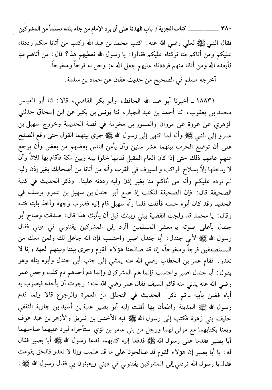 18831 - أَخْبَرَنَا أَبُو عَبْدِ اللهِ الْحَافِظُ، وَأَبُو بَكْرٍ الْقَاضِي قَالَا: ثنا أَبُو الْعَبَّاسِ مُحَمَّدُ بْنُ يَعْقُوبَ , ثنا أَحْمَدُ بْنُ عَبْدِ الْجَبَّارِ، ثنا يُونُسُ بْنُ بُكَيْرٍ، عَنِ ابْنِ إِسْحَاقَ، حَدَّثَنِي الزُّهْرِيُّ، عَنْ عُرْوَةَ، عَنْ مَرْوَانَ، وَالْمِسْوَرِ بْنِ مَخْرَمَةَ، فِي قِصَّةِ الْحُدَيْبِيَةِ وَخُرُوجِ سُهَيْلِ بْنِ عَمْرٍو إِلَى النَّبِيِّ صَلَّى اللهُ عَلَيْهِ وَسَلَّمَ وَأَنَّهُ لَمَّا انْتَهَى إِلَى رَسُولِ اللهِ صَلَّى اللهُ عَلَيْهِ وَسَلَّمَ جَرَى بَيْنَهُمَا الْقَوْلُ حَتَّى وَقَعَ الصُّلْحُ عَلَى أَنْ §تُوضَعَ الْحَرْبُ بَيْنَهُمَا عَشْرَ سِنِينَ , وَأَنْ يَأْمَنَ النَّاسُ بَعْضُهُمْ مِنْ بَعْضٍ , وَأَنْ يَرْجِعَ عَنْهُمْ عَامَهُمْ ذَلِكَ حَتَّى إِذَا كَانَ الْعَامُ الْمُقْبِلُ قَدِمَهَا خَلَّوْا بَيْنَهُ وَبَيْنَ مَكَّةَ فَأَقَامَ بِهَا ثَلَاثًا , وَأَنْ لَا يَدْخُلُهَا إِلَّا بِسِلَاحِ الرَّاكِبِ وَالسُّيُوفِ فِي الْقُرُبِ , وَأَنَّهُ مَنْ أَتَانَا مِنْ أَصْحَابِكَ بِغَيْرِ إِذْنِ وَلِيِّهِ لَمْ نَرُدَّهُ عَلَيْكُمْ , وَأَنَّهُ مَنْ أَتَاكُمْ مِنَّا بِغَيْرِ إِذْنِ وَلِيِّهِ رَدَدْتَهُ عَلَيْنَا , وَذَكَرَ الْحَدِيثَ فِي كَتَبَةِ الصَّحِيفَةِ قَالَ: فَإِنَّ الصَّحِيفَةَ لَتُكْتَبُ إِذْ طَلَعَ أَبُو جَنْدَلِ بْنُ سُهَيْلِ بْنِ عَمْرٍو يَرْسُفُ فِي الْحَدِيدِ وَقَدْ كَانَ أَبُوهُ حَبَسَهُ فَأَفْلَتَ , فَلَمَّا رَآهُ سُهَيْلٌ قَامَ إِلَيْهِ فَضَرَبَ وَجْهَهُ وَأَخَذَ بِلُبَّتِهِ فَتَلَّهُ وَقَالَ: يَا مُحَمَّدُ قَدْ وَلِجَتِ الْقَضِيَّةُ بَيْنِي وَبَيْنَكَ قَبْلَ أَنْ يَأْتِيَكَ هَذَا. قَالَ: " صَدَقْتَ ". وَصَاحَ أَبُو جَنْدَلٍ بِأَعْلَى صَوْتِهِ: يَا مَعْشَرَ الْمُسْلِمِينَ أَأُرَدُّ إِلَى الْمُشْرِكِينَ يَفْتِنُونَنِي فِي دِينِي؟ فَقَالَ رَسُولُ اللهِ صَلَّى اللهُ عَلَيْهِ وَسَلَّمَ لِأَبِي جَنْدَلٍ: " أَبَا جَنْدَلٍ اصْبِرْ وَاحْتَسِبْ فَإِنَّ اللهَ جَاعِلٌ لَكَ وَلِمَنْ مَعَكَ مِنَ الْمُسْتَضْعَفِينَ فَرَجًا وَمَخْرَجًا , إِنَّا قَدْ صَالَحْنَا هَؤُلَاءِ الْقَوْمَ وَجَرَى بَيْنَنَا وَبَيْنَهُمُ الْعَهْدُ , وَإِنَّا لَا نَغْدِرُ ". فَقَامَ عُمَرُ بْنُ الْخَطَّابِ رَضِيَ اللهُ عَنْهُ يَمْشِي إِلَى جَنْبِ أَبِي جَنْدَلٍ وَأَبُوهُ يَتُلُّهُ وَهُوَ يَقُولُ: أَبَا جَنْدَلٍ اصْبِرْ وَاحْتَسِبْ فَإِنَّمَا هُمُ الْمُشْرِكُونَ , وَإِنَّمَا دَمُ أَحَدِهِمْ دَمُ كَلْبٍ. وَجَعَلَ عُمَرُ رَضِيَ اللهُ عَنْهُ يُدْنِي مِنْهُ قَائِمَ السَّيْفِ فَقَالَ عُمَرُ رَضِيَ اللهُ عَنْهُ: رَجَوْتُ أَنْ يَأْخُذَهُ فَيَضْرِبَ بِهِ أَبَاهُ فَضَنَّ بِأَبِيهِ. ثُمَّ ذَكَرَ الْحَدِيثَ فِي التَّحَلُّلِ مِنَ الْعُمْرَةِ وَالرُّجُوعِ , قَالَا: وَلَمَّا قَدِمَ رَسُولُ اللهِ صَلَّى اللهُ عَلَيْهِ وَسَلَّمَ الْمَدِينَةَ وَاطْمَأَنَّ بِهَا أَفْلَتَ إِلَيْهِ أَبُو بَصِيرٍ عُتْبَةُ بْنُ أَسِيدِ بْنِ جَارِيَةَ الثَّقَفِيُّ حَلِيفُ بَنِي زُهْرَةَ , فَكَتَبَ إِلَى رَسُولِ اللهِ صَلَّى اللهُ عَلَيْهِ وَسَلَّمَ فِيهِ الْأَخْنَسُ بْنُ شَرِيقٍ وَالْأَزْهَرُ بْنُ عَبْدِ عَوْفٍ وَبَعَثَا بِكِتَابِهِمَا مَعَ مَوْلًى لَهُمَا وَرَجُلٍ مِنْ بَنِي عَامِرِ بْنِ لُؤَيٍّ اسْتَأْجَرَاهُ لِيَرُدَّ عَلَيْهِمَا صَاحِبَهُمَا أَبَا بَصِيرٍ فَقَدِمَا عَلَى رَسُولِ اللهِ صَلَّى اللهُ عَلَيْهِ وَسَلَّمَ فَدَفَعَا إِلَيْهِ كِتَابَهُمَا، فَدَعَا رَسُولُ اللهِ صَلَّى اللهُ عَلَيْهِ وَسَلَّمَ أَبَا بَصِيرٍ فَقَالَ لَهُ: " يَا أَبَا بَصِيرٍ إِنَّ هَؤُلَاءِ الْقَوْمَ قَدْ صَالَحُونَا عَلَى مَا قَدْ عَلِمْتَ , وَإِنَّا لَا نَغْدِرُ فَالْحَقْ بِقَوْمِكَ ". فَقَالَ: يَا رَسُولَ اللهِ تَرُ