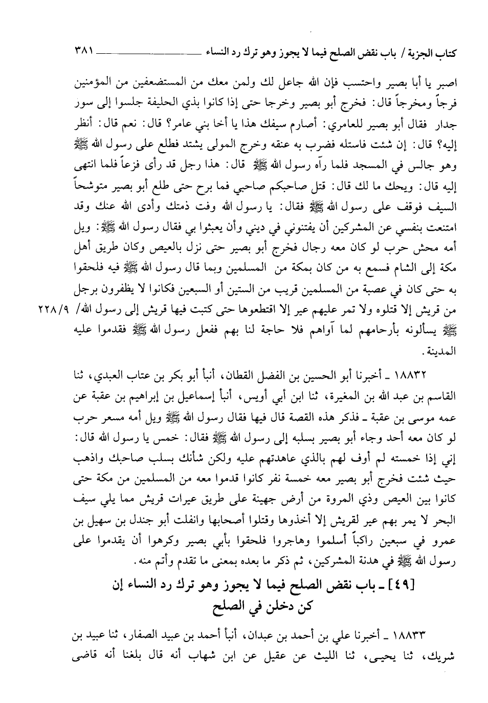 18832 - أَخْبَرَنَا أَبُو الْحُسَيْنِ بْنُ الْفَضْلِ الْقَطَّانُ، أنبأ أَبُو بَكْرِ بْنُ عَتَّابٍ الْعَبْدِيُّ، ثنا الْقَاسِمُ بْنُ عَبْدِ اللهِ بْنُ الْمُغِيرَةِ، ثنا ابْنُ أَبِي أُوَيْسٍ، أنبأ إِسْمَاعِيلُ بْنُ إِبْرَاهِيمَ بْنِ عُقْبَةَ، عَنْ عَمِّهِ مُوسَى بْنِ عُقْبَةَ فَذَكَرَ هَذِهِ الْقِصَّةَ قَالَ فِيهَا: فَقَالَ رَسُولُ اللهِ صَلَّى اللهُ عَلَيْهِ وَسَلَّمَ: " وَيْلُ امِّهِ مِسْعَرَ حَرْبٍ لَوْ كَانَ مَعَهُ أَحَدٌ ". وَجَاءَ أَبُو بَصِيرٍ بِسَلَبِهِ إِلَى رَسُولِ اللهِ صَلَّى اللهُ عَلَيْهِ وَسَلَّمَ فَقَالَ: خَمِّسْ يَا رَسُولَ اللهِ. قَالَ: " إِنِّي §إِذَا خَمَّسْتُهُ لَمْ أُوْفِ لَهُمْ بِالَّذِي عَاهَدْتُهُمْ عَلَيْهِ وَلَكِنْ شَأْنُكَ بِسَلَبِ صَاحِبِكَ وَاذْهَبْ حَيْثُ شِئْتَ ". فَخَرَجَ أَبُو بَصِيرٍ مَعَهُ خَمْسَةُ نَفَرٍ كَانُوا قَدِمُوا مَعَهُ مِنَ الْمُسْلِمِينَ مِنْ مَكَّةَ حَتَّى كَانُوا بَيْنَ الْعِيصِ وَذِي الْمَرْوَةِ مِنْ أَرْضِ جُهَيْنَةَ عَلَى طَرِيقِ عِيرَاتِ قُرَيْشٍ مِمَّا يَلِي سِيفَ الْبَحْرِ لَا يَمُرُّ بِهِمْ عِيرٌ لِقُرَيْشٍ إِلَّا أَخَذُوهَا وَقَتَلُوا أَصْحَابَهَا , وَانْفَلَتَ أَبُو جَنْدَلِ بْنُ سُهَيْلِ بْنِ عَمْرٍو فِي سَبْعِينَ رَاكِبًا أَسْلَمُوا وَهَاجَرُوا فَلَحِقُوا بِأَبِي بَصِيرٍ وَكَرِهُوا أَنْ يَقْدَمُوا عَلَى رَسُولِ اللهِ صَلَّى اللهُ عَلَيْهِ وَسَلَّمَ فِي هُدْنَةِ الْمُشْرِكِينَ , ثُمَّ ذَكَرَ مَا بَعْدَهُ بِمَعْنَى مَا تَقَدَّمَ وَأَتَمَّ مِنْهُ