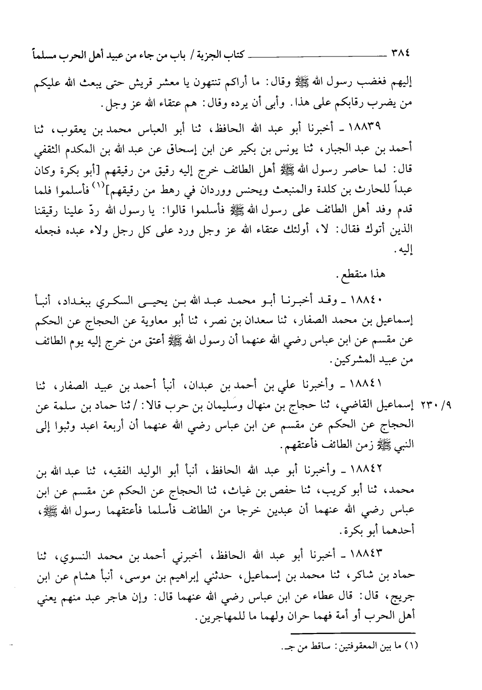 18840 - وَقَدْ أَخْبَرَنَا أَبُو مُحَمَّدٍ عَبْدُ اللهِ بْنُ يَحْيَى السُّكَّرِيُّ بِبَغْدَادَ , أنبأ إِسْمَاعِيلُ بْنُ مُحَمَّدٍ الصَّفَّارُ، ثنا سَعْدَانُ بْنُ نَصْرٍ، ثنا أَبُو مُعَاوِيَةَ، عَنِ الْحَجَّاجِ، عَنِ الْحَكَمِ، عَنْ مِقْسَمٍ، عَنِ ابْنِ عَبَّاسٍ رَضِيَ اللهُ عَنْهُمَا أَنَّ رَسُولَ اللهِ صَلَّى اللهُ عَلَيْهِ وَسَلَّمَ §أَعْتَقَ مَنْ خَرَجَ إِلَيْهِ يَوْمَ الطَّائِفِ مِنْ عَبِيدِ الْمُشْرِكِينَ
