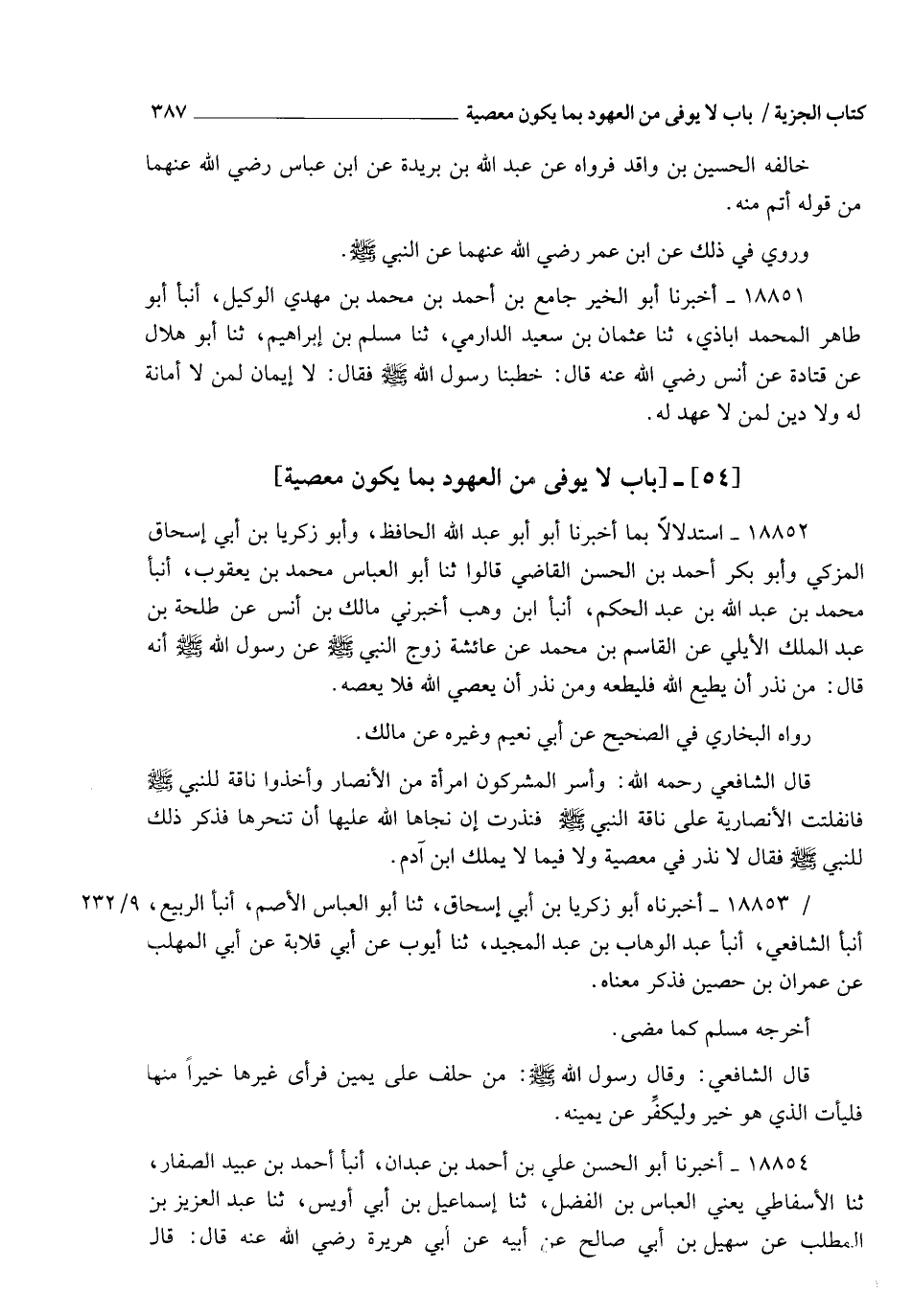 18854 - أَخْبَرَنَا أَبُو الْحَسَنِ عَلِيُّ بْنُ أَحْمَدَ بْنِ عَبْدَانَ , أنبأ أَحْمَدُ بْنُ عُبَيْدٍ الصَّفَّارُ، ثنا الْأَسْفَاطِيُّ يَعْنِي الْعَبَّاسَ بْنَ الْفَضْلِ، ثنا إِسْمَاعِيلُ بْنُ أَبِي أُوَيْسٍ، ثنا عَبْدُ الْعَزِيزِ بْنُ الْمُطَّلِبِ، عَنْ سُهَيْلِ بْنِ أَبِي صَالِحٍ، عَنْ أَبِيهِ، عَنْ أَبِي هُرَيْرَةَ رَضِيَ اللهُ عَنْهُ قَالَ: قَالَ -[388]- رَسُولُ اللهِ صَلَّى اللهُ عَلَيْهِ وَسَلَّمَ: §" مَنْ حَلَفَ عَلَى يَمِينٍ فَرَأَى غَيْرَهَا خَيْرًا مِنْهَا فَلْيَأْتِ الَّذِي هُوَ خَيْرٌ، وَلْيُكَفِّرْ عَنْ يَمِينِهِ ". رَوَاهُ مُسْلِمٌ فِي الصَّحِيحِ عَنْ زُهَيْرِ بْنِ حَرْبٍ عَنْ إِسْمَاعِيلَ بْنِ أَبِي أُوَيْسٍ قَالَ الشَّافِعِيُّ: فَاعْلَمْ أَنَّ طَاعَةَ اللهِ أَنْ لَا يَفِيَ بِالْيَمِينِ إِذَا كَانَ غَيْرُهَا خَيْرًا , وَأَنْ يُكَفِّرَ بِمَا فَرَضَ اللهُ مِنَ الْكَفَّارَةِ , وَكُلُّ هَذَا يَدُلُّ عَلَى أَنَّهُ إِنَّمَا يُوَفَّى بِكُلِّ عَقْدٍ نَذَرَ وَعَهْدٍ لِمُسْلِمٍ أَوْ مُشْرِكٍ كَانَ مُبَاحًا لَا مَعْصِيَةَ لِلَّهِ فِيهِ